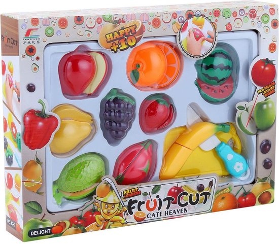 Snijfruitset met snijplankje. Snij alle fruitsoorten in deze set doormidden. Na het snijden kan je de helften meteen weer aan elkaar plakken door de klitteband op beide helften. Stimuleert de cognitieve vaardigheden en kleurenherkenning.