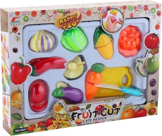 Snijgroentenset met snijplankje. Snij alle groenten in deze set doormidden. Na het snijden kan je de helften meteen weer aan elkaar plakken door de klitteband op beide helften. Stimuleert de cognitieve vaardigheden en kleurenherkenning.