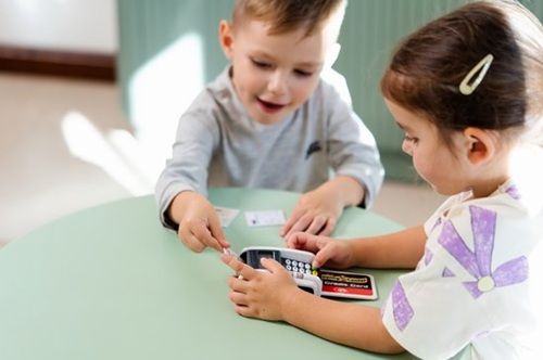 De uitbreiding op batterijen voor speelgoedkassa’s biedt een creditcardsleuf met geluidseffecten en een contactloze betaalfunctie. Bij de accessoires zijn drie bonnenboekjes en een creditcard met contactloze betaalfunctie inbegrepen.