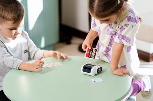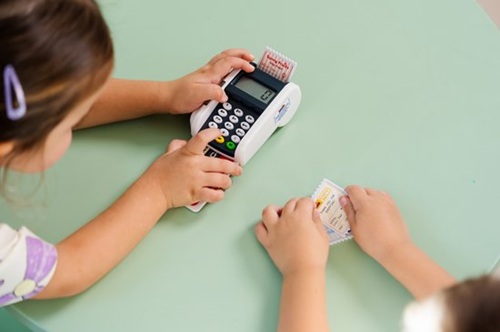 Zo werk het betalen van de toekomst: met betaalkaarten, een moderne terminal en veel plezier. Deze moderne uitbreiding voor speelgoedkassa’s brengt de realiteit naar de kinderkamer. Bij betaling met creditcard zijn er echte shoppinggeluiden te horen bij het insteken van de kaart in de terminal of bij de contactloze betaalfunctie: gewoon het bedrag invoeren, bevestigen, de creditcard tegen de zijkant van de terminal houden, pincode intoetsen, bevestigen en de betaling is gelukt. Zo blijft er meer tijd over voor vriendelijke gesprekjes met de klanten over het weer, de producten en hoe het gaat, wat dan weer de fantasie en het communicatievermogen van de kleine kassiers traint.