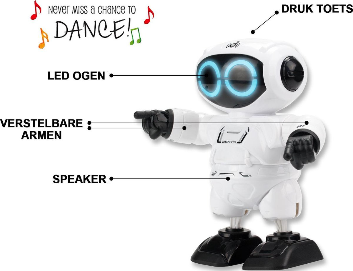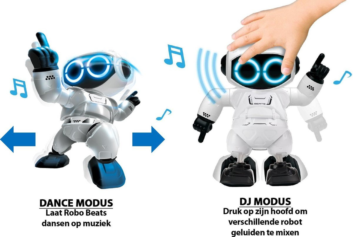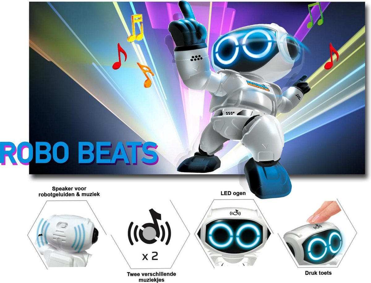 De stoere Robo Beats is een dansrobot met LED verlichte ogen en 2 spelmogelijkheden die je kunt activeren met een druktoets op zijn hoofd. Druk op zijn hoofd in Dansmodus en Robo Beats zal dansen op de beats van twee verschillende muziekjes. Hij loopt van