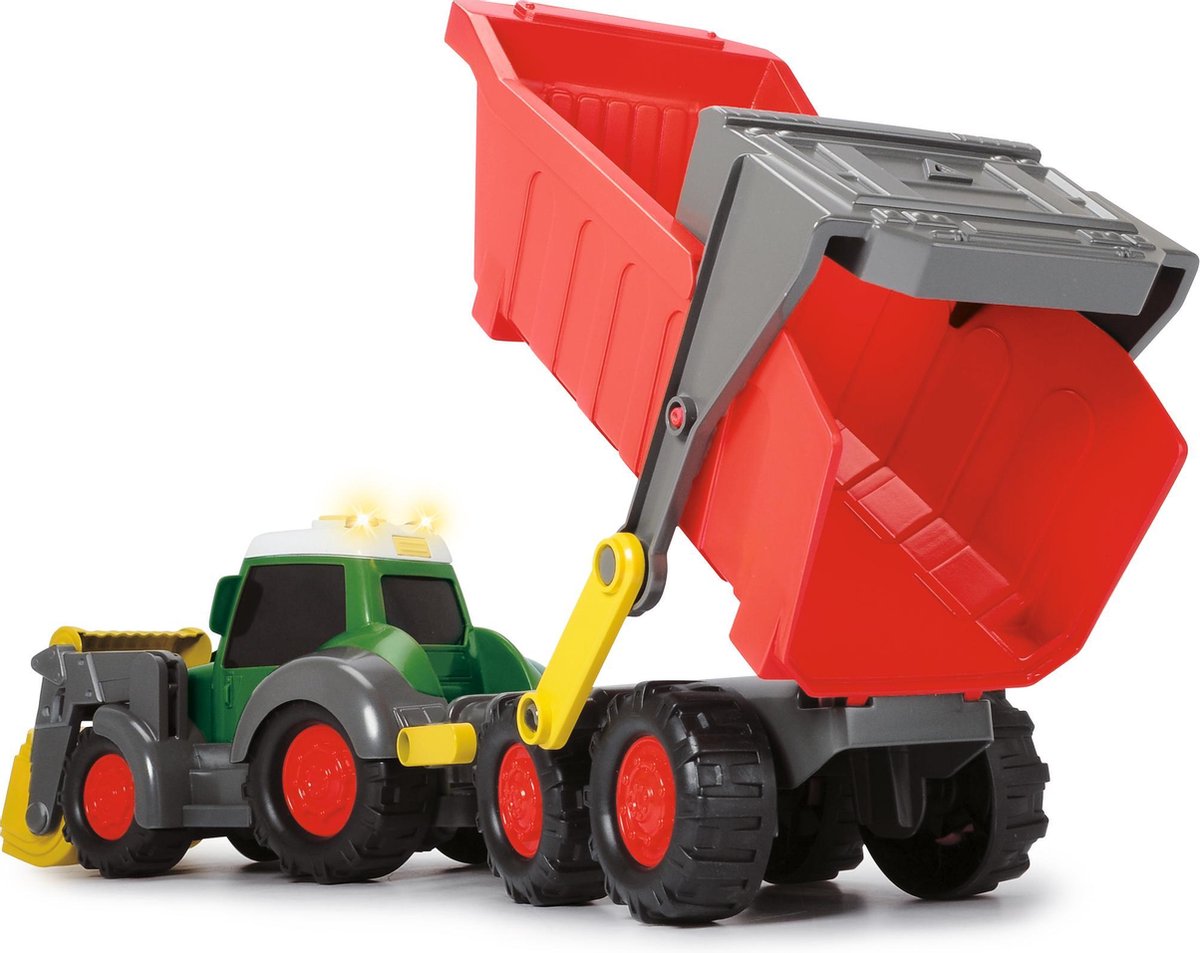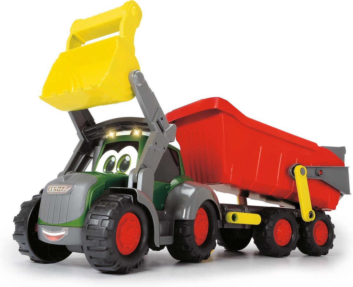 De ABC Farm tractor met aanhanger valt op met zijn 65 cm! Ook deze freewheeltractor is voorzien van licht- en geluidseffecten. De voorste schop kan met de hand worden opgetild en neergelaten en kan indien nodig worden verwijderd om te helpen bij het laden