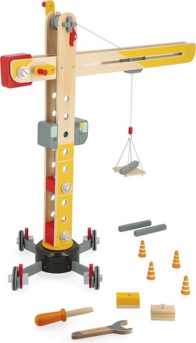 Deze prachtige kraan in hout-, oranje- en roodtinten is uitgerust met 10 accessoires en 2 gereedschappen. Hij is gemaakt van FSC®-hout (hout uit duurzaam beheerde bossen).