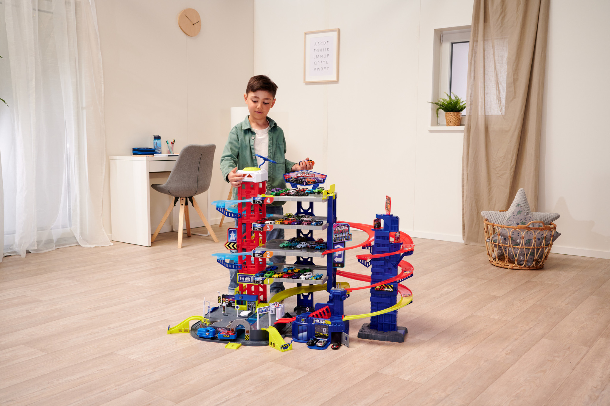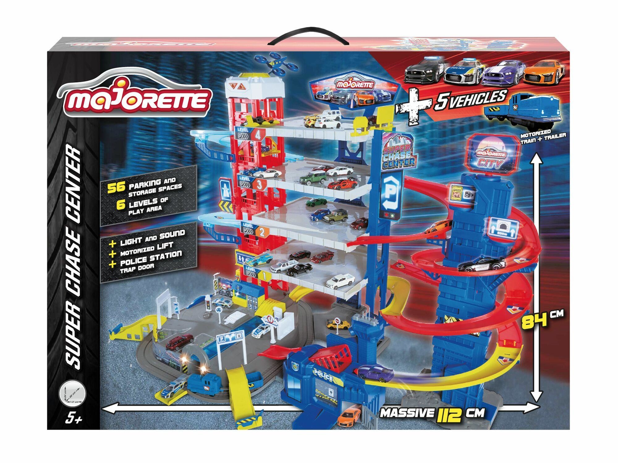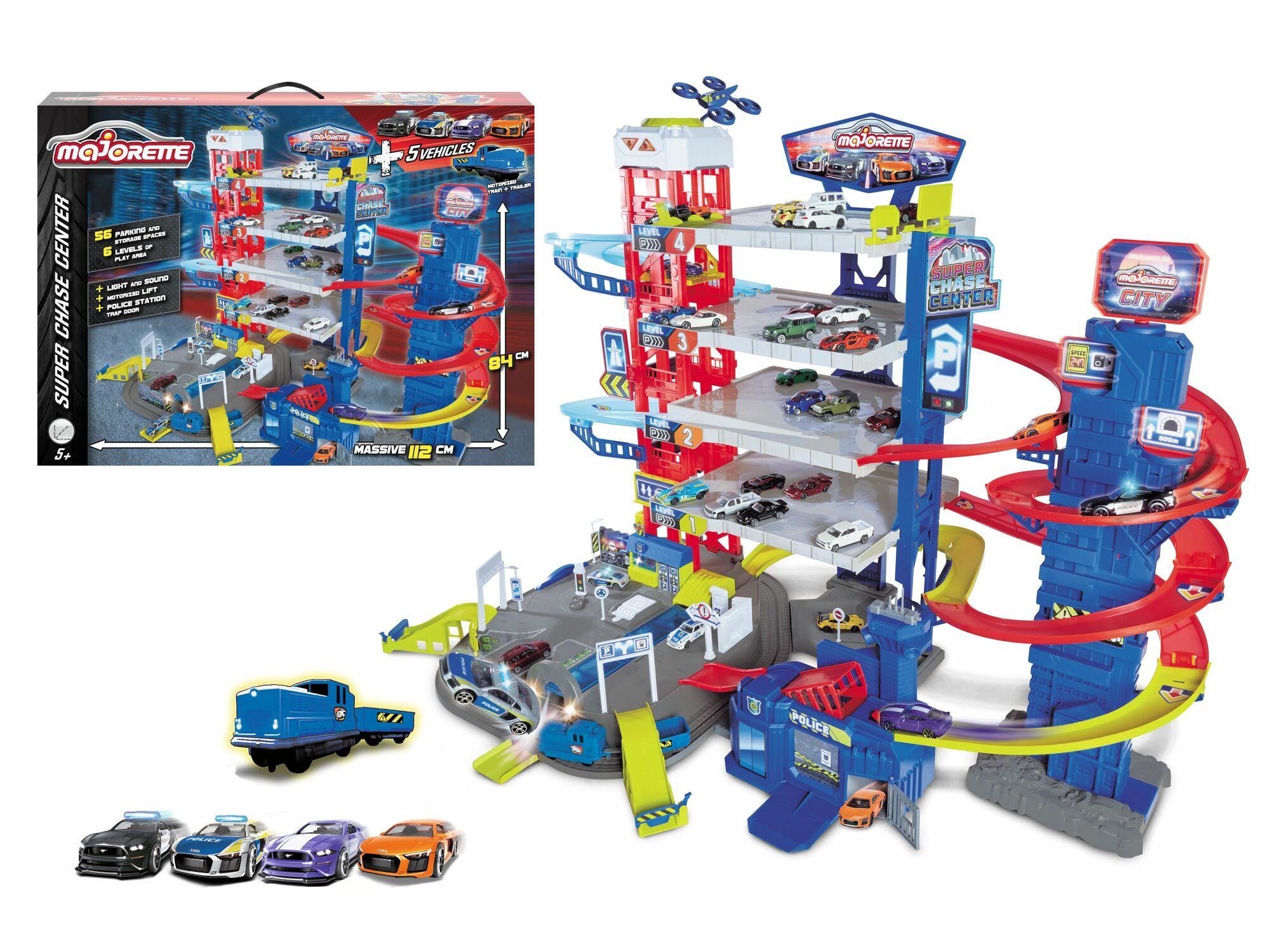 Beleef eindeloos speelplezier met het indrukwekkende Majorette Super Chase Center: een gigantische parkeergarage met vijf verdiepingen, vol actie, licht- en geluidseffecten en spannende funct