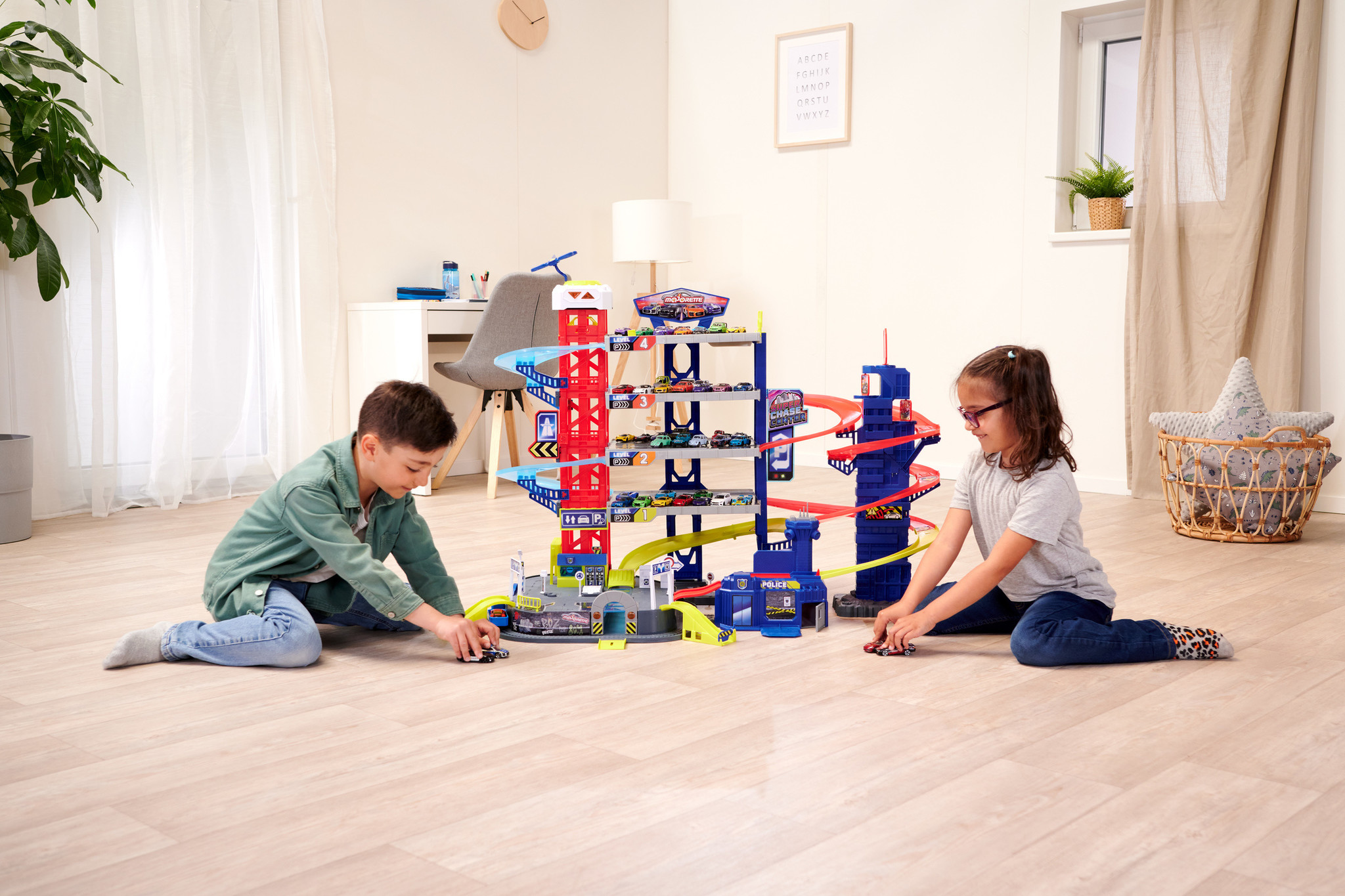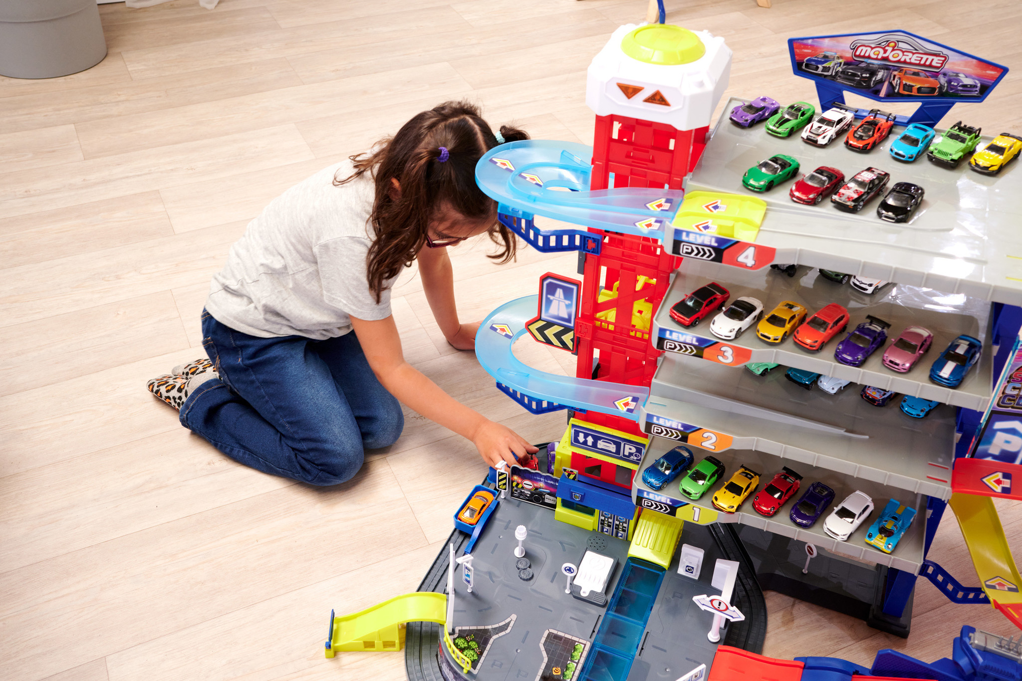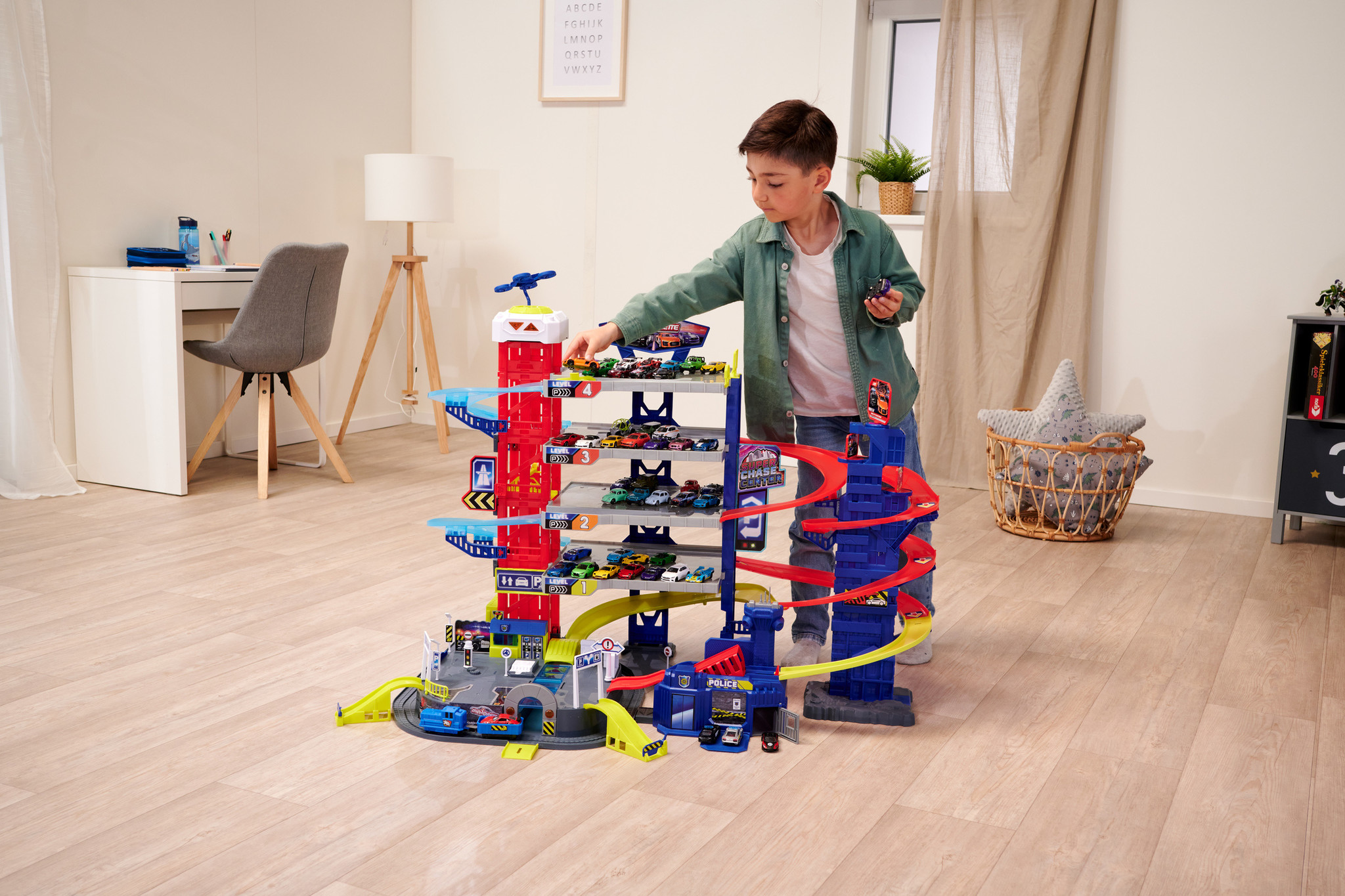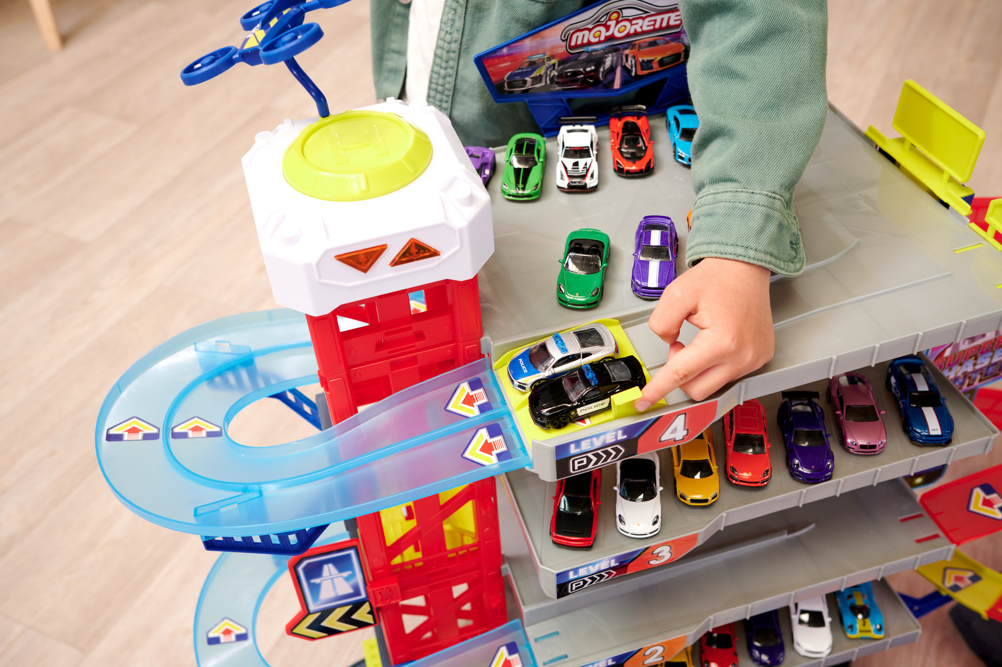 Beleef eindeloos speelplezier met het indrukwekkende Majorette Super Chase Center: een gigantische parkeergarage met vijf verdiepingen, vol actie, licht- en geluidseffecten en spannende funct