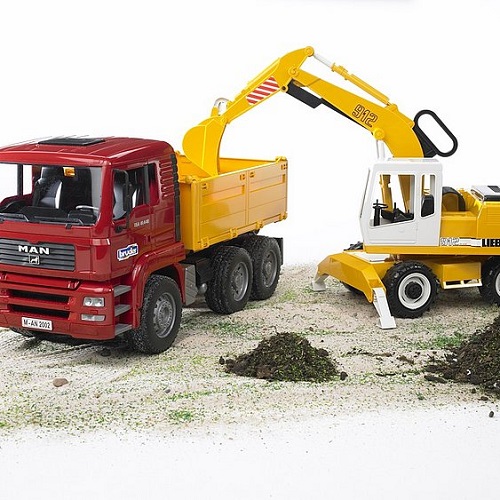 Deze Bruder set bestaat uit een stoere MAN TGA kiepwagen en een Liebherr graafmachine. De MAN TGA vrachtwagen van Bruder heeft twee achterassen zodat hij ook goed in de zandbak kan werken. De laadbak van de MAN vrachtwagen kan kiepen, zodat je het geschep