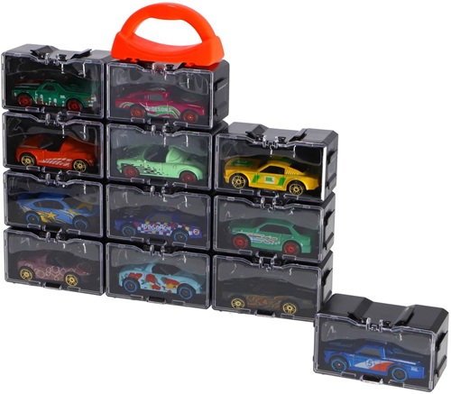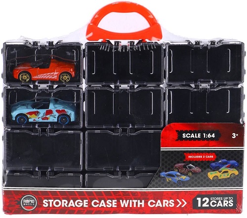 Rapid Wheels opbergboxmet twee die-cast auto’s die vrij kunnen rijden zonder batterijen. Ideaal voor kinderen vanaf 3 jaar om mee te spelen en gemakkelijk op te bergen.