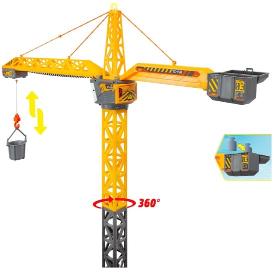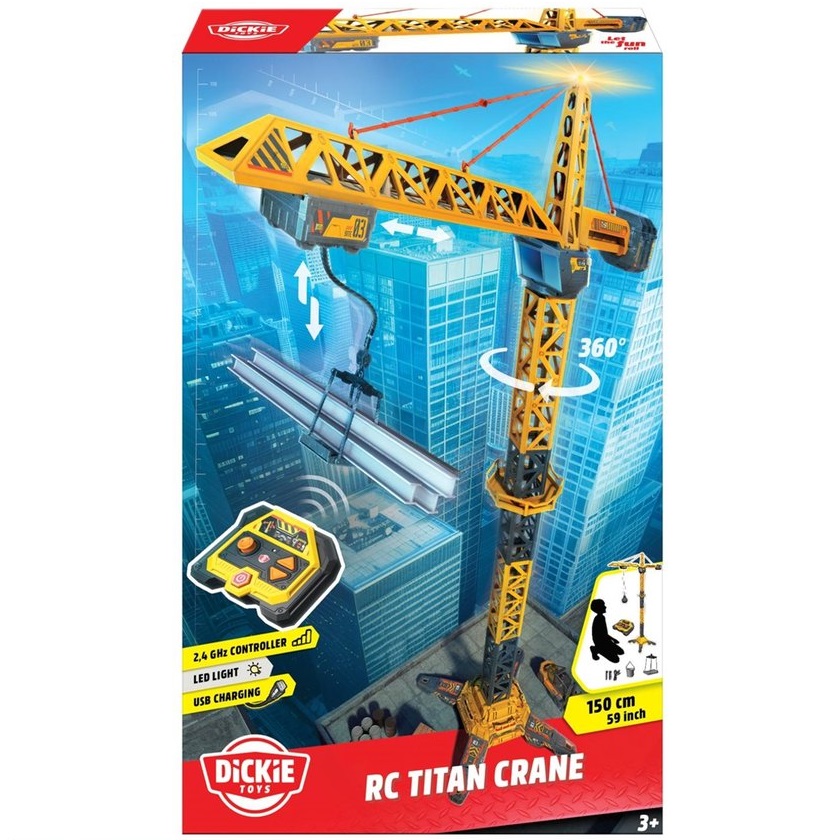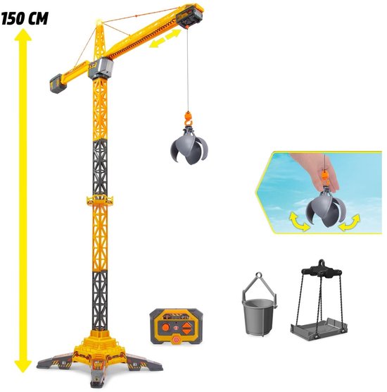 Dickie 203729025 RC Titan-kraan – – Dickie Toys – RC Titan Crane (150 cm) – op afstand bestuurbare speelgoedkraan met 360°-draaiing en interactieve accessoires, speelgoedkraan met afstandsbediening en verlichting voor kinderen vanaf 3 jaar, incl. batterijen. – – Met een gigantische hoogte van 1,50 meter torent de RC Titan Crane boven elke bouwplaats in de kinderkamer uit! De interactieve torenkraan is snel in elkaar te zetten en dankzij de meegeleverde batterijen en extra lange USB-oplaadkabel in een mum van tijd klaar voor gebruik. De oplaad- en speeltijd bedraagt telkens ongeveer 120 minuten. Met de nauwkeurige 2,4 GHz-afstandsbediening hebben kleine bouwprofessionals vanaf 3 jaar de volledige controle over de speelgoedkraan – voor spannende bouwavonturen met coole functies! – – Grijpen, heffen, draaien: jouw bouwplaats, jouw regels! – – Of het nu gaat om het laden van vracht, het slopen van gebouwen of het stapelen van bouwblokken – met de kraanaccessoires zoals een emmer, laadplatform en sloopkogel met grijparmen zijn de meisjes en jongens uitgerust voor elk speelscenario! Omhoog of omlaag, links of rechts, vooruit of achteruit: de op afstand bestuurbare speelgoedkraan met beweegbare loopkat en 360°-draaiing kan in alle richtingen worden bestuurd en brengt het bouwmateriaal precies daar waar het nodig is. Op een speelse manier worden zo de fijne motoriek, coördinatie en het ruimtelijk denkvermogen van kinderen gestimuleerd. Het geïntegreerde licht aan de bovenkant van het bouw speelgoed zorgt voor de juiste sfeer en geeft de laadstatus van de accu aan. Net als in het echt moet bij het heffen van zwaardere materialen het tegengewicht aan de kraan worden verhoogd door de container aan de kraanarm te vullen met knikkers, munten of iets dergelijks. – – – Alle batterijen en een extra lange USB-oplaadkabel inbegrepen – Hoogte 150 cm – Vanaf 3 jaar