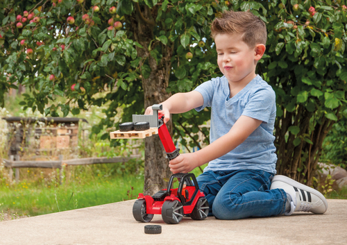LENA® TRUXX² verreiker met rubberen banden, 4 mm gegalvaniseerde stalen assen, bestuurderscabine bijvoorbeeld, 2-traps hefarm uitschuifbaar tot 34 cm, vergrendelbare vork met handgreep, trekhaak en LENA® speelfiguur.