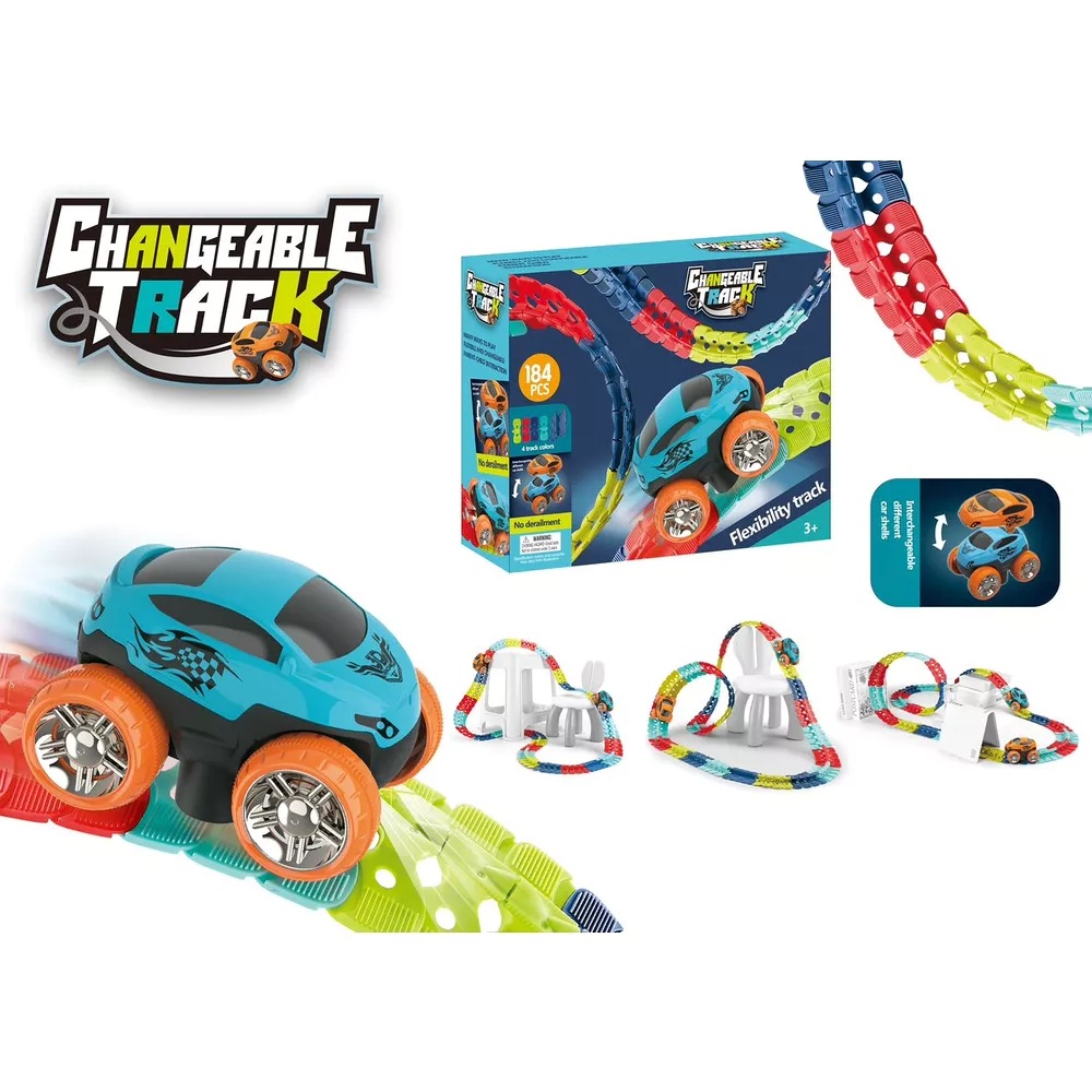 Met de Changeable Track racebaan beleef je eindeloos bouw- en raceplezier! De set bestaat uit 184 flexibele onderdelen waarmee je steeds weer een nieuwe baan kunt creëren, compleet met loops, bochten en hellingen. De meegeleverde lichtgevende raceauto raa