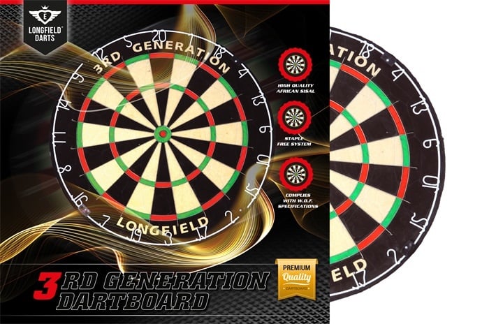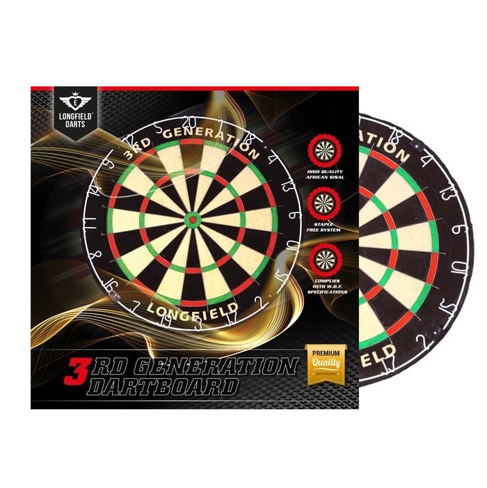 Longfield dartbord 3rd generation – Wedstrijd dartbord met volledig ingelegde bedrading en anti-reflectie cijferring. Gemaakt van topkwaliteit Keniaans sisal. Voldoet aan de wereldwijd geldende competitie-eisen. In vernieuwde verpakking!