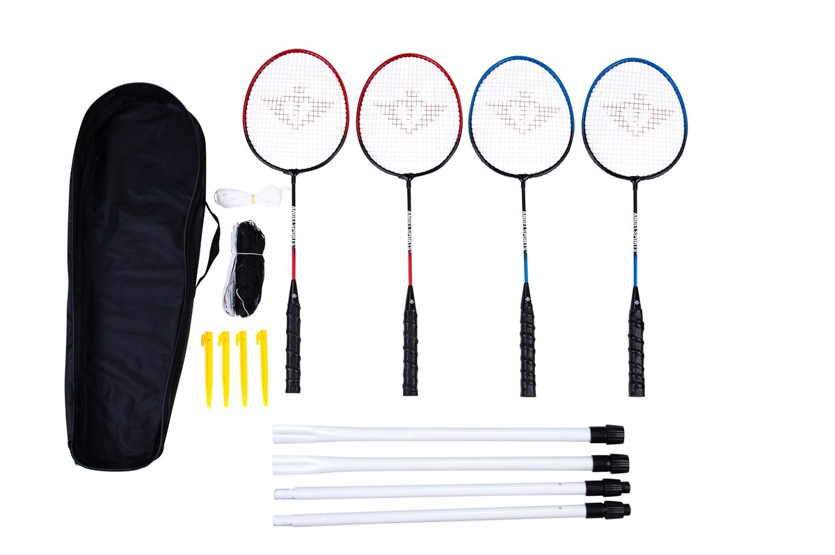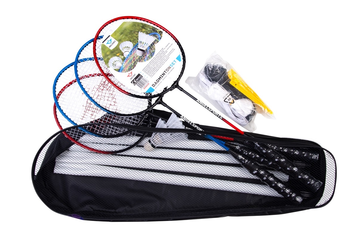Angel Sports Badmintonset voor 4 spelers incl. 4 rackets ((2-kleurig met eyelets), 2 shuttles, twee 3-delige staanders (buis Ø 25mm), 1 net, 4 haringen en scheerlijnen, verpakt in draagtas. Het badmintonspel is voor iedereen, van jong tot oud. Deze badmin