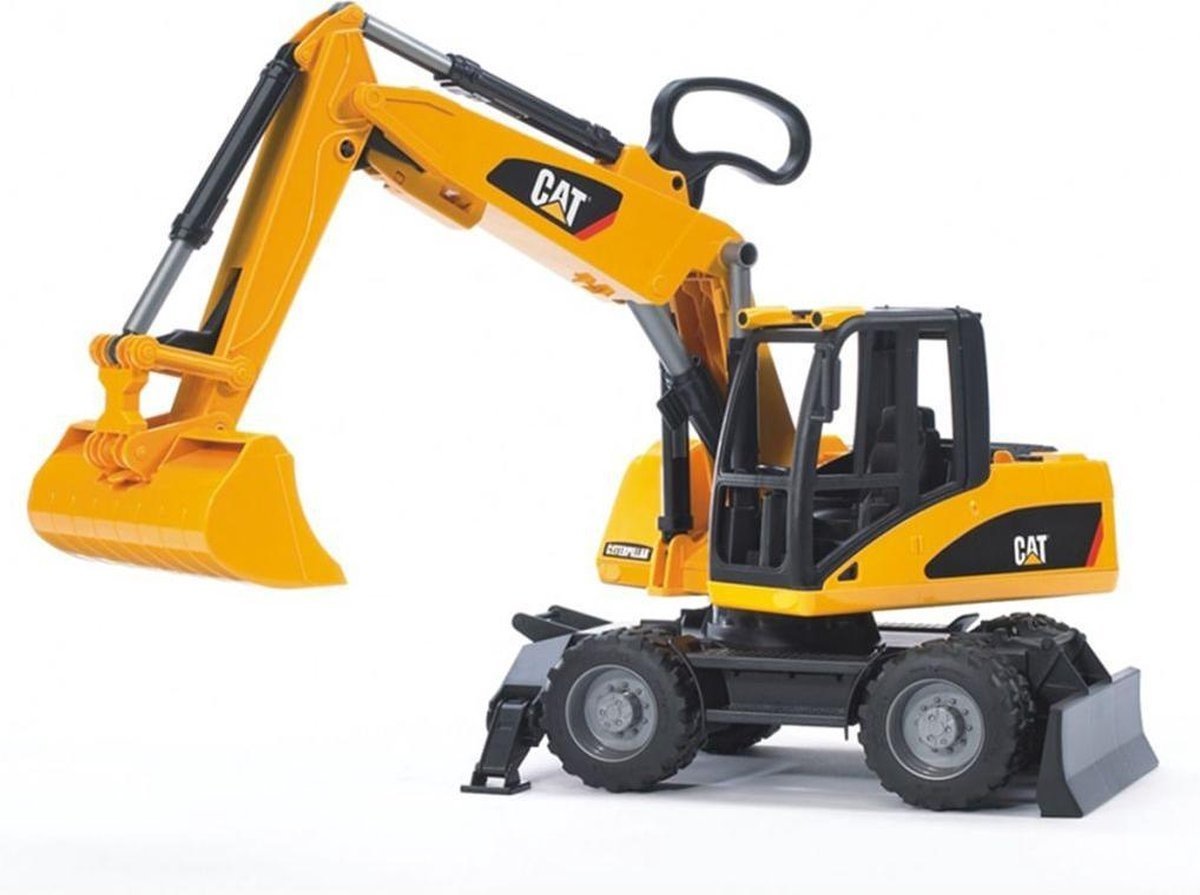 De Cat® graafmachine op wielen van Bruder zorgt ervoor dat ook werk in krappe ruimtes een peulenschil wordt! Zet de graafmachine stevig op de grond met de twee steunpoten en bedien de kraanarm met de gearticuleerde besturing. De kraan kan 360º draaien en de schep kan verwijderd worden. Dankzij de profielbanden heeft de graafmachine een goede grip op de ongelijke bouwgrond. Wanneer je de kraan over de weg vervoert, kan je de kraanarm vergrendelen in een compacte transportpositie.
