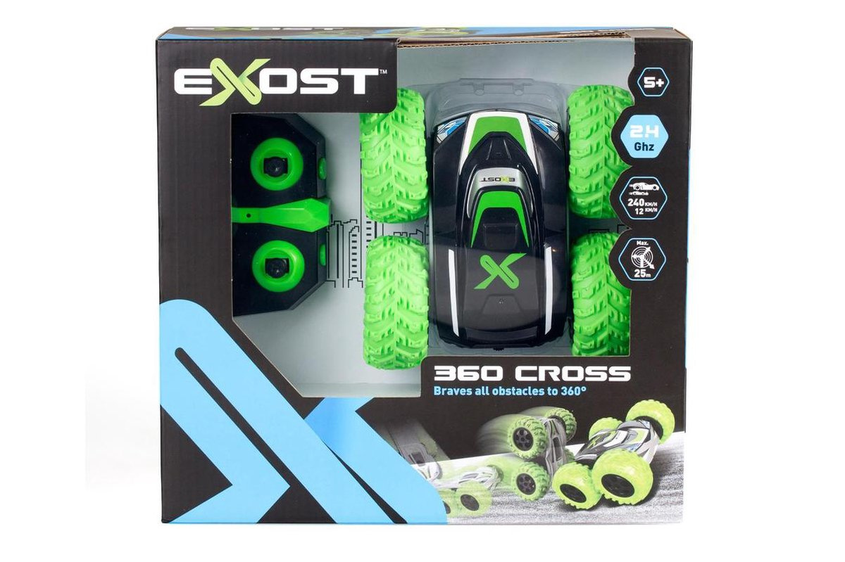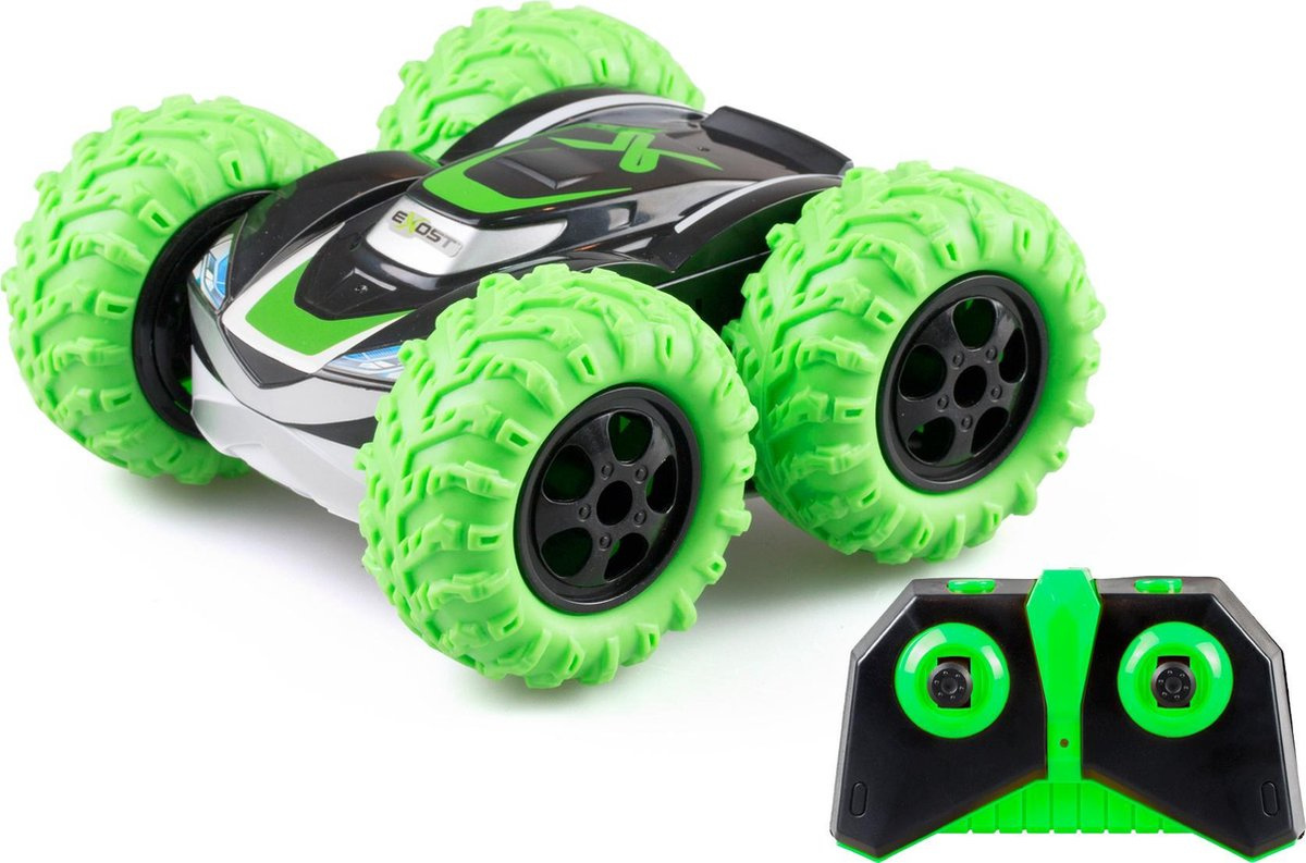 De Exost RC 360 Cross met zijn groene banden kan 360 graden spinnen, een flip maken en op twee kanten rijden. Bestuur deze stuntauto eenvoudig met de controller. De grote, ultra duurzame banden kunnen met gemak alle ondergronden aan! De RC 360 Cross is