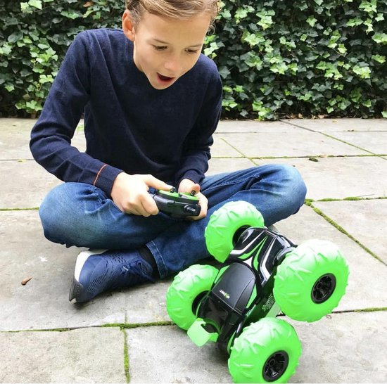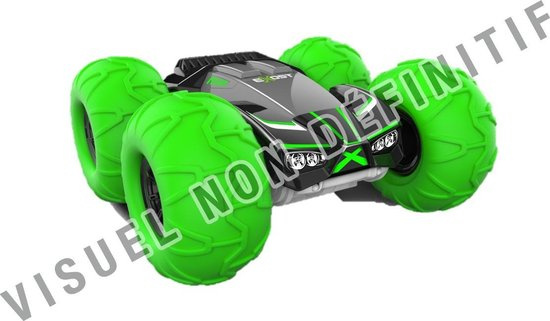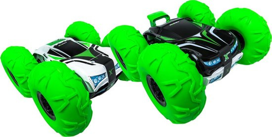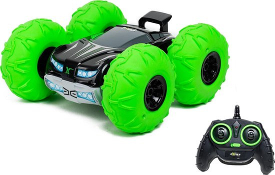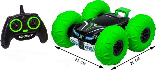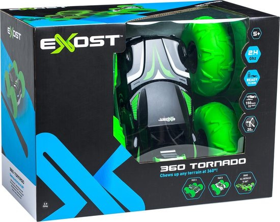 Er is geen ondergrond te gek voor de nieuwe Exost 360 Tornado! Door de enorme groene wielen van deze 2.4 GHz control system stuntauto kun je de coolste acrobatische flips maken! De auto kan op twee kanten rijden en neemt feilloos alle hindernissen. Ook kan de Tornado 360 graden spinnen, een nieuwe, sensationele ervaring! Schaal: 1:10. Afmeting auto: 25x23x12cm (lxbxh). Bereik: 20 meter. Batterij informatie: Auto: 8 x AA batterijen (niet meegeleverd) – Controller: 1 x 9V batterij (niet meegeleverd). Leeftijdsindicatie: 5 jaar+.