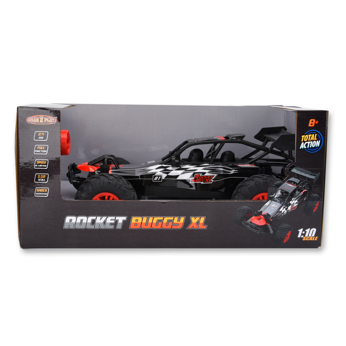 De Gear2Play Rocket Buggy XL is een op afstand bestuurbare race buggy met een schaal van 1:10. Deze grote, stoere raceauto van wel 40 cm lang met is vliegensvlug en voorzien van schokdempers. Rijd met de Turbo Buggy zowel binnen als buitenhuis. Met de