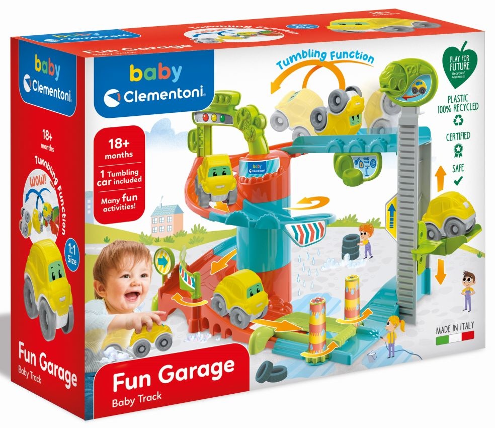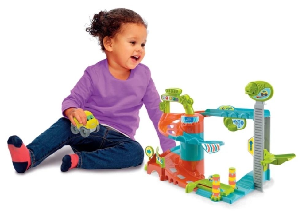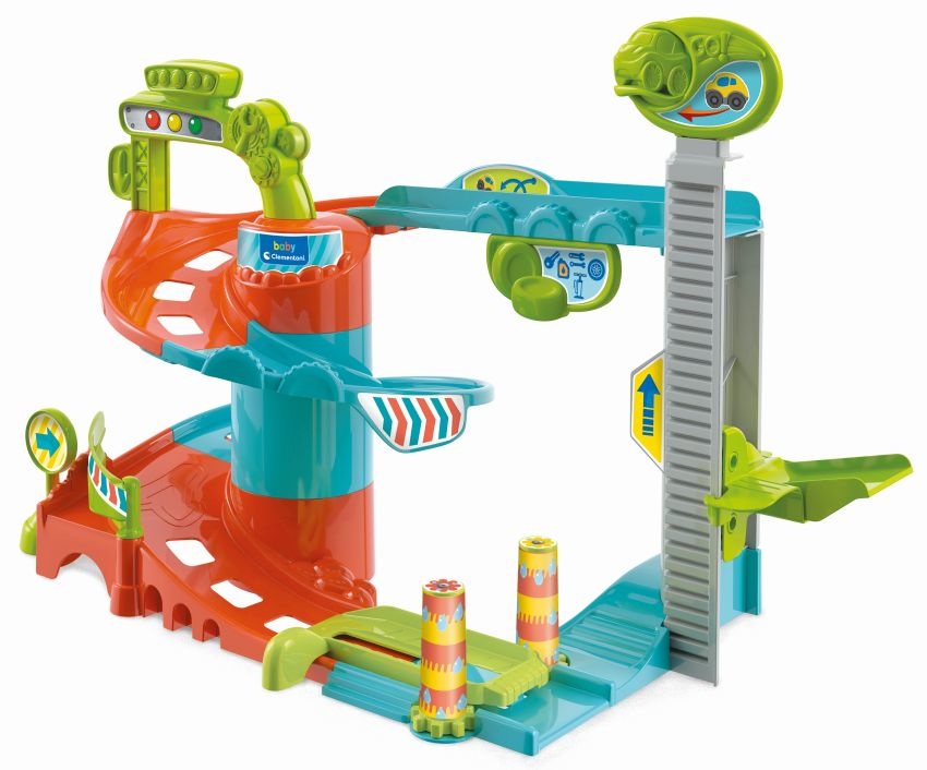 De auto van dit spel tuimelt naar beneden over de baan, met spannende buitelingen die de nieuwsgierigheid van het kind stimuleren. Het handbediende liftsysteem brengt de auto terug naar het begin van het parcours, zoals bij een echte garage! Langs de w