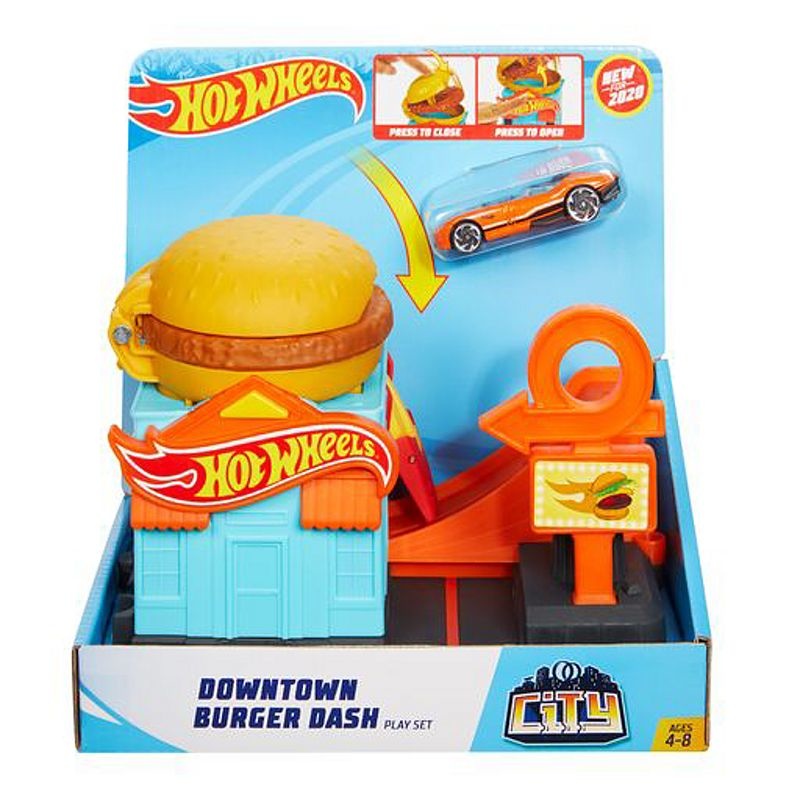 Prikkel de fantasie van kinderen met deze populaire sets met herkenbare plekken in de stad. Begin je trek te krijgen? Bestel dan een hamburger bij de Hamburgertent! Gebruik de lanceerder met frietjesthema om je een weg te banen door de reusachtige hamburger en door de hamburgertent weer naar buiten te komen. Met deze kleurige set kun je allerlei verhalen naspelen met je Hot Wheels® voertuigen. Alles past op elkaar! Elke set kan aan andere Hot Wheels™ City speelsets worden gekoppeld. Ook geschikt voor gebruik met de oranje baan. Inclusief één Hot Wheels® voertuig.