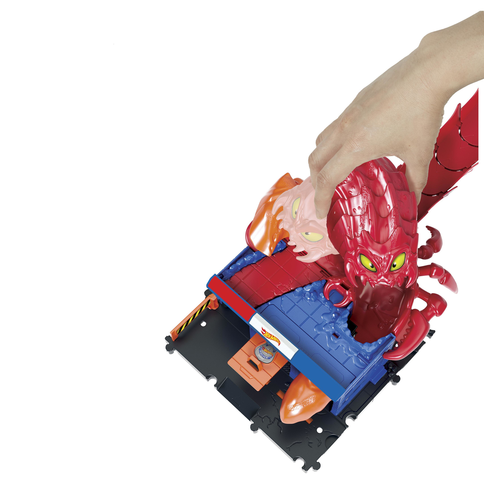 Sven de Schorpioen heeft zijn klauwen diep in het politiebureau gezet en hij heeft reuzenhonger! De baan van de staart is maar liefst 75 cm lang en kinderen laten hun auto’s een vrije val maken door ze door een van de twee vluchtroutes in het politiebureau te sturen. De set bevat één Hot Wheels auto en kan aan andere sets worden gekoppeld voor avonturen met andere bijzondere figuren – kinderen willen ze allemaal verzamelen. Per stuk verkrijgbaar en niet overal leverbaar. Kleuren en versieringen kunnen afwijken.