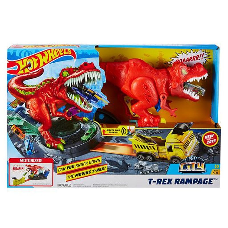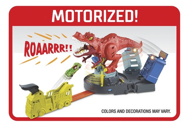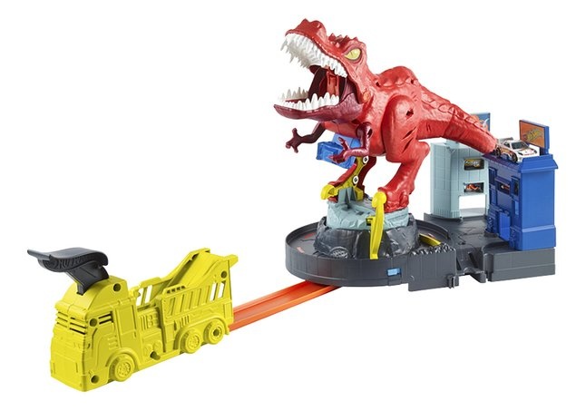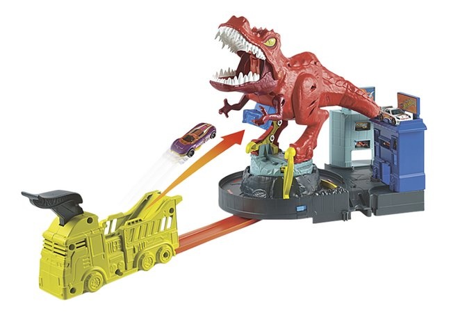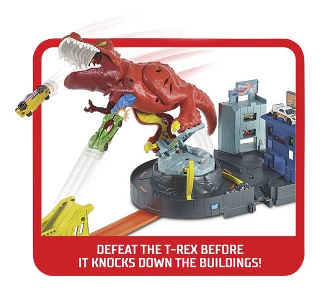 Hot Wheels™ City wordt aangevallen door een gigantische T-Rex en jij moet ons helpen! T-Rex komt tot leven met geluiden en gemotoriseerde bewegingen, en jij bent de enige die hem kan verslaan en de stad kan redden! Lanceer je auto in de richting van de draaiende dinosaurus en knal hem omver voordat hij de gebouwen van de stad neermaait. Maar wees voorzichtig! Als je de dinosaurus mist, is de kans groot dat je in de maag van een hongerige T-Rex verdwijnt! De geluidseffecten maken het nog leuker: terwijl de T-Rex zijn staart heen en weer zwiept, hoor je hem brullen, knagen en zelfs boeren! De Razende T-Rex set kan aan de rest van de Hot Wheels™ City sets worden gekoppeld voor eindeloze mogelijkheden. Breid de Hot Wheels® speelwereld uit door nog meer sets en banen te combineren.