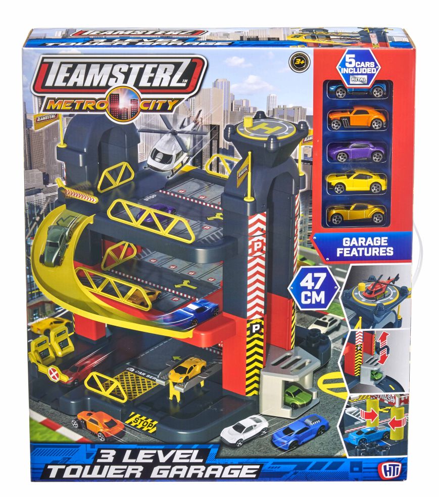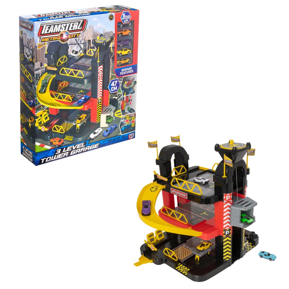Breng voertuigplezier naar een ander niveau! Deze leuke torengaragespeelset met 3 niveaus stimuleert fantasierijk voertuigspel. De set beschikt over een helikopterplatform, brandstofpompen, een autowasstraat, slagbomen, parkeerplaatsen en een werkende