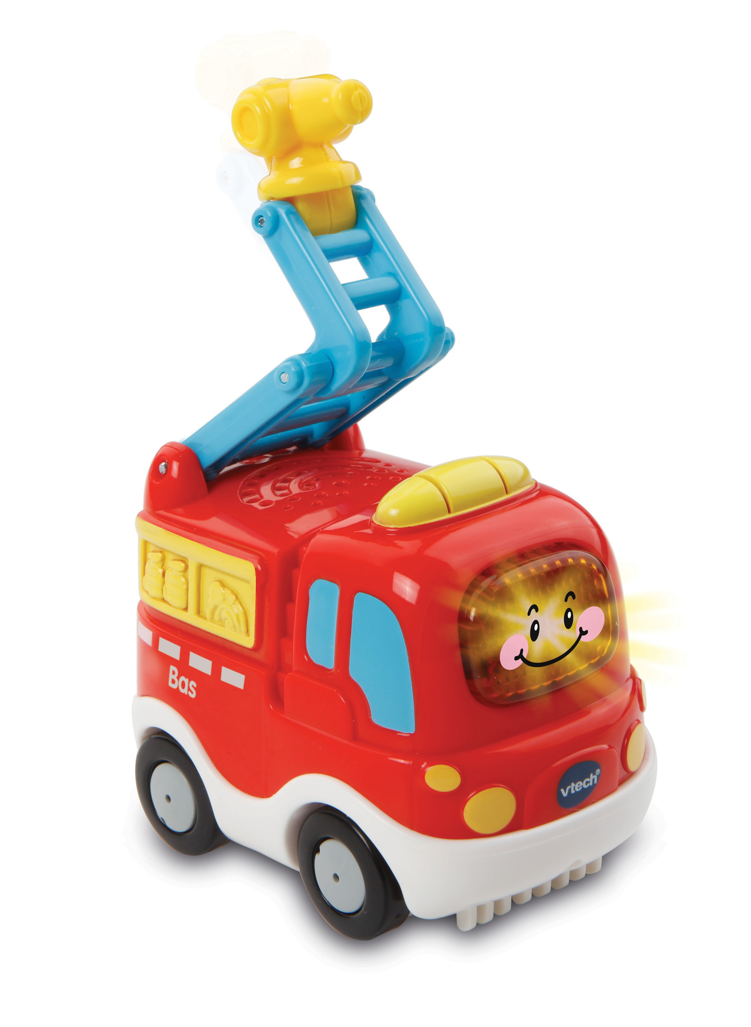 Ga omhoog met de lift en laat Bas Brandweer of andere Toet Toet Auto’s (apart verkrijgbaar) het vuur blussen op het helling-wegdeel. Of laat het voertuig via het draaibaar platform supersnel naar beneden draaien om zo snel mogelijk naar de brand te rac