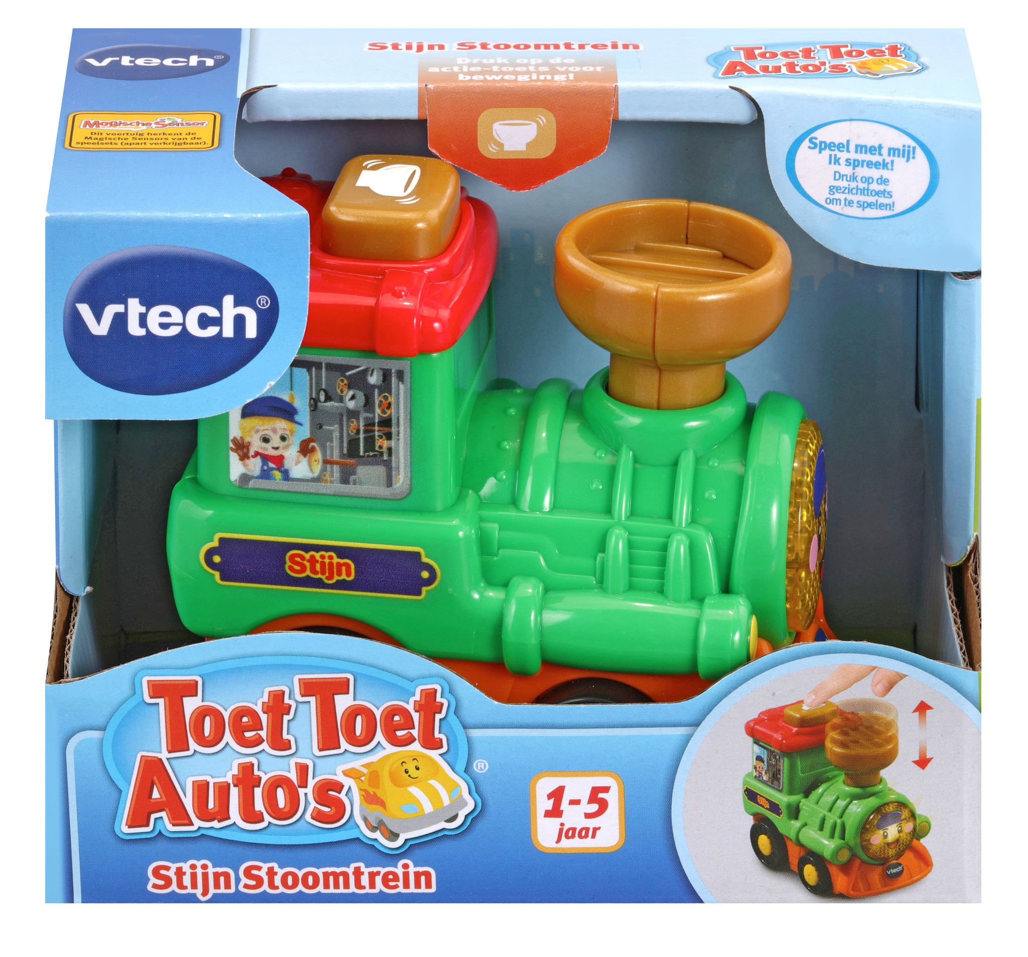 Druk op de knipperende gezicht-toets om geluidseffecten, vrolijke zinnetjes en gezongen liedjes te horen. Druk op de actie-toets om de schoorsteen te bewegen en grappige geluidjes te horen. Kom en bezoek de mooiste plekjes met Stijn Stoomtrein!
