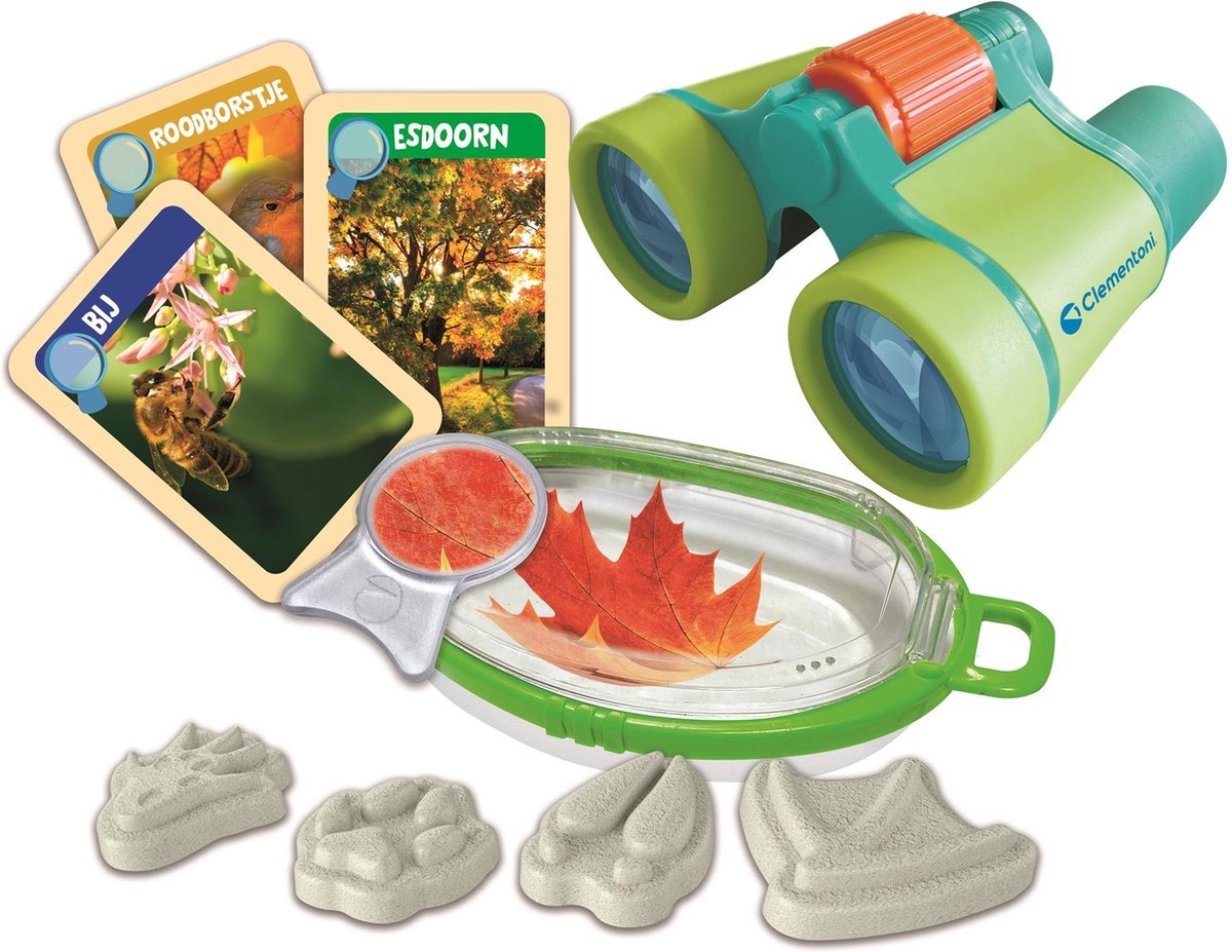 De perfecte set voor kleine ontdekkingsreizigers in de dop! Beleef talloze avonturen in de natuur! Een koffertje met alles wat kinderen nodig hebben om de natuur te observeren. Inclusief: een vogelkijker, een speciale insectenloep, gipsen vormen voor h