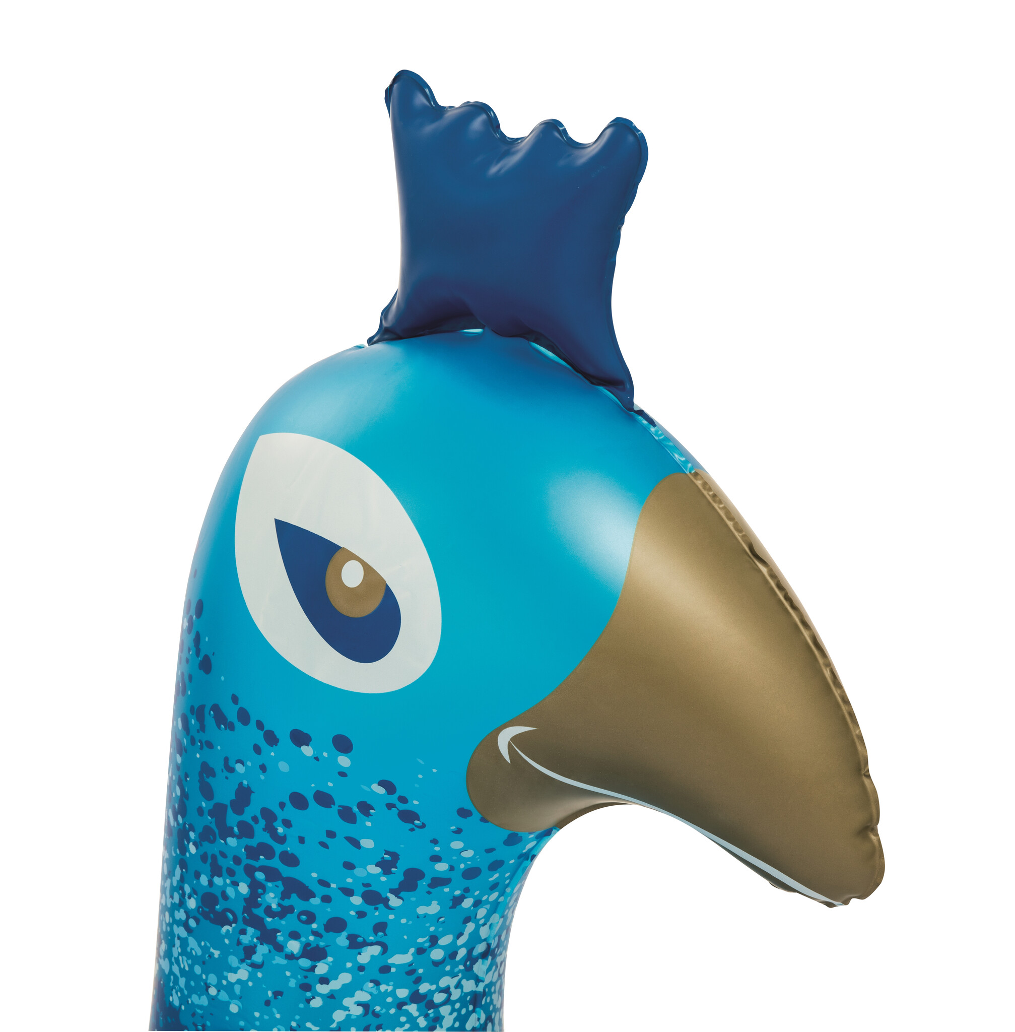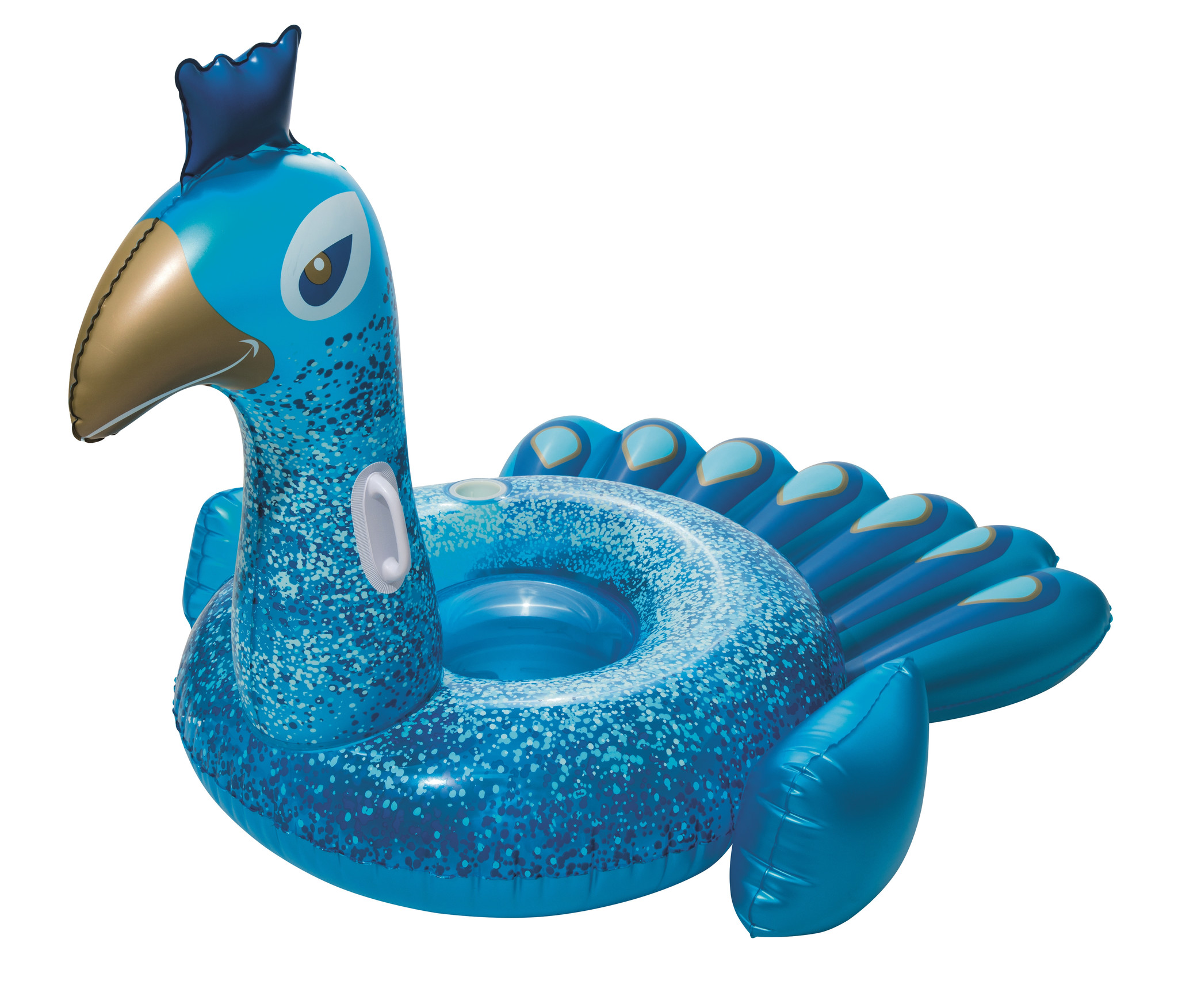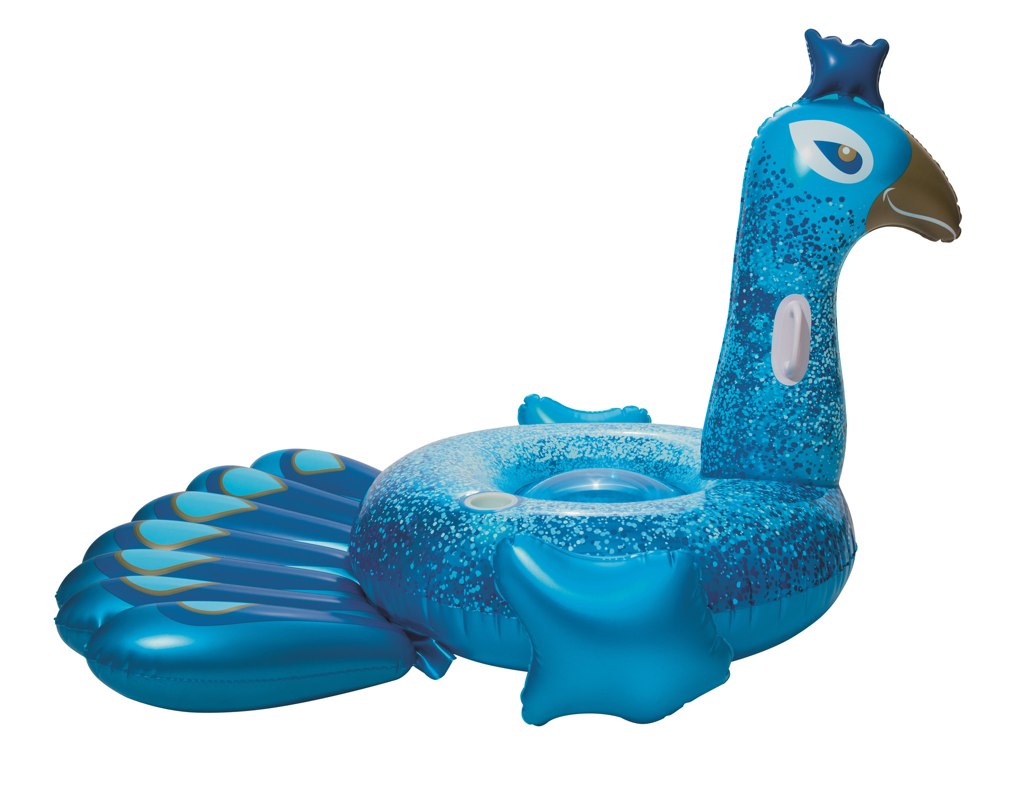 Jumbo rider in de vorm van een pauw. Comfortabele rider met sterke handgrepen, 1 bekerhouder en incl. reparatie patch. Geschikt voor 1 volwassene, max. gewicht 90 kg. Van 0,45 mm vinyl. Afmeting: 173x135x112 cm.