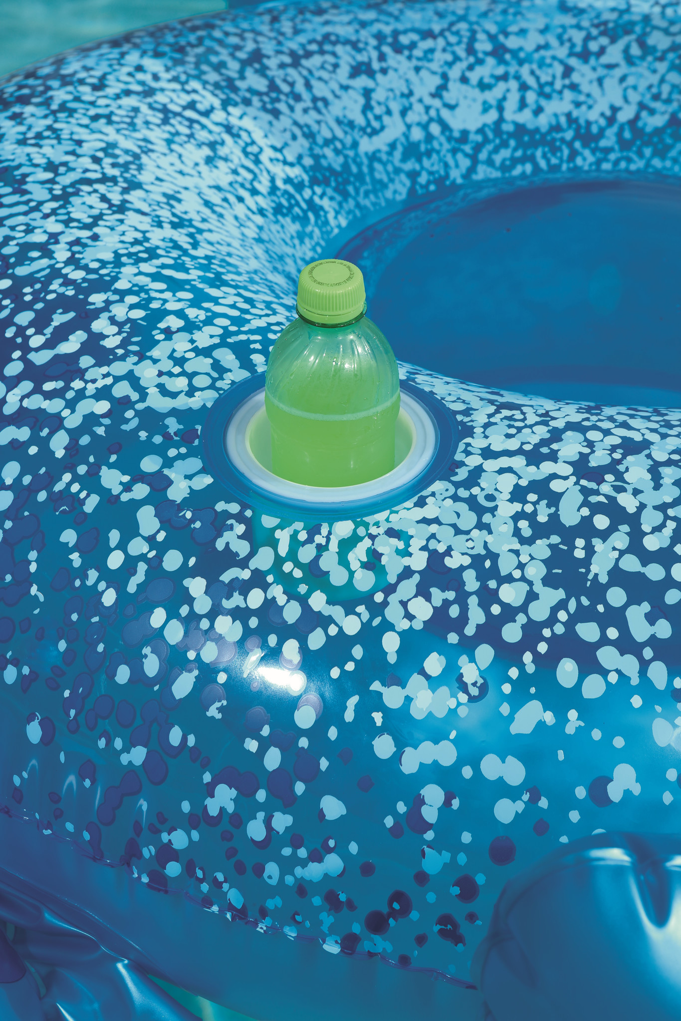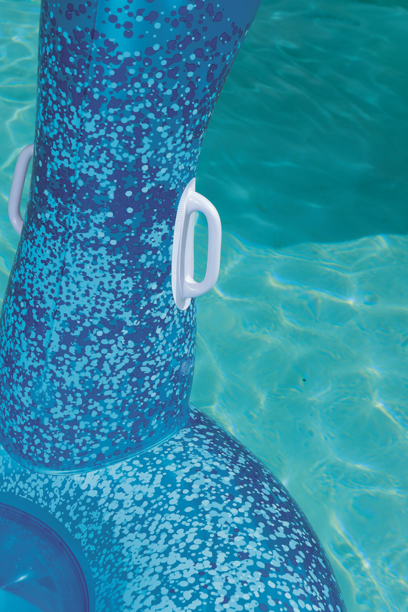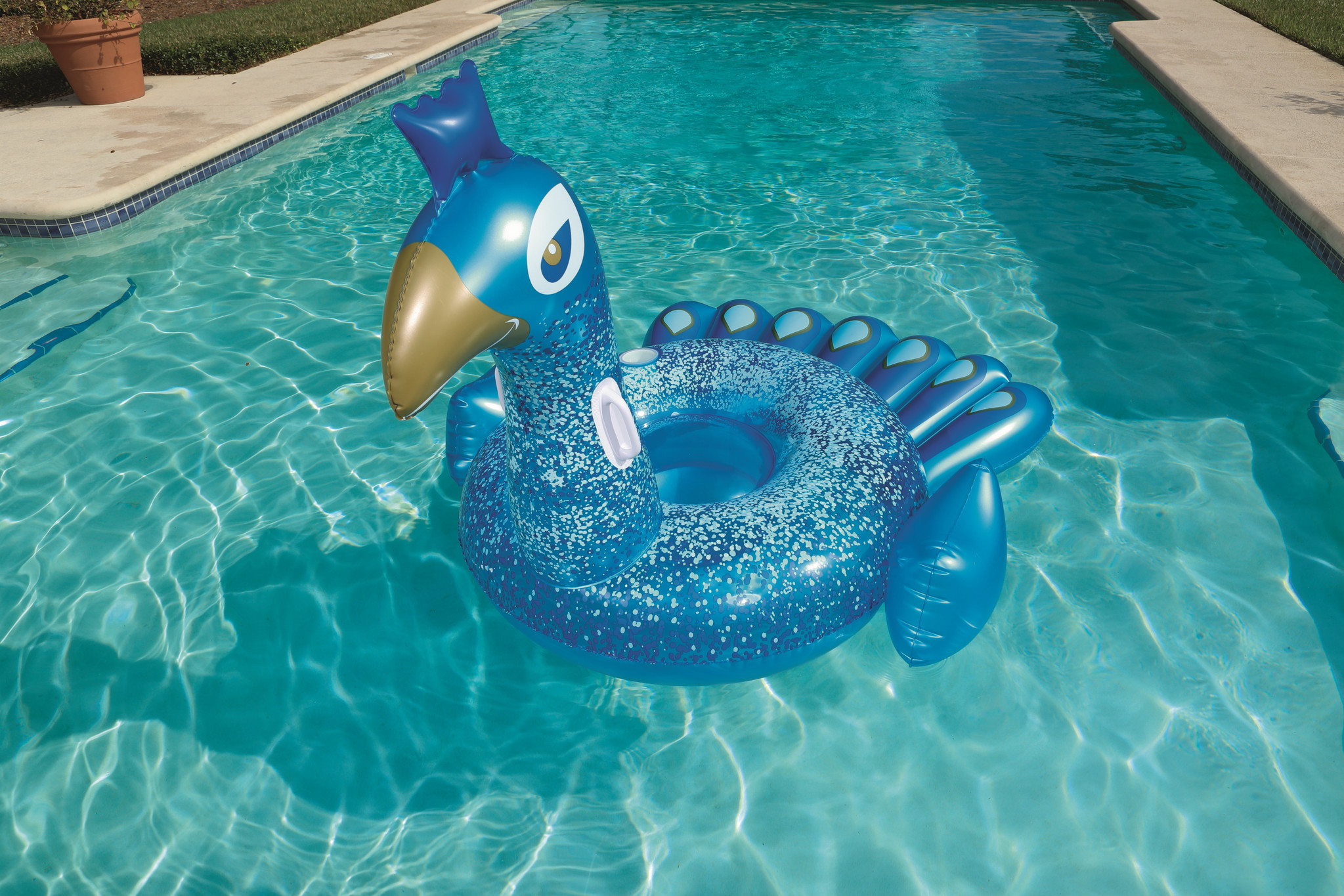 Jumbo rider in de vorm van een pauw. Comfortabele rider met sterke handgrepen, 1 bekerhouder en incl. reparatie patch. Geschikt voor 1 volwassene, max. gewicht 90 kg. Van 0,45 mm vinyl. Afmeting: 173x135x112 cm.