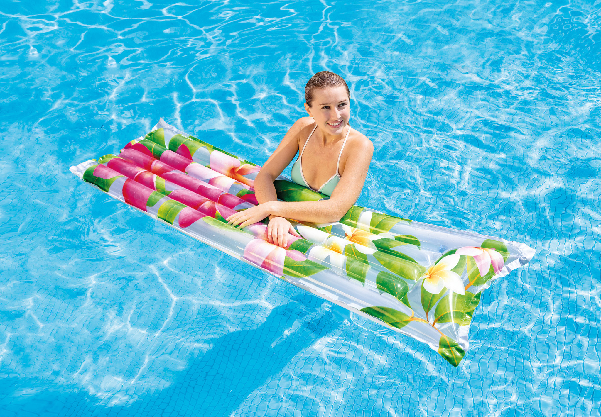 Dit luchtbed heeft een vrolijke print, waardoor je extra op zult vullen in het water of aan de waterkant. Afmetingen: 183 x 69 cm (L x B)