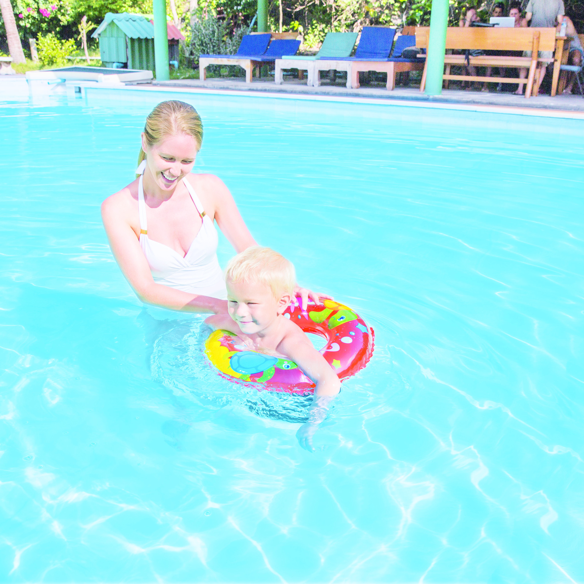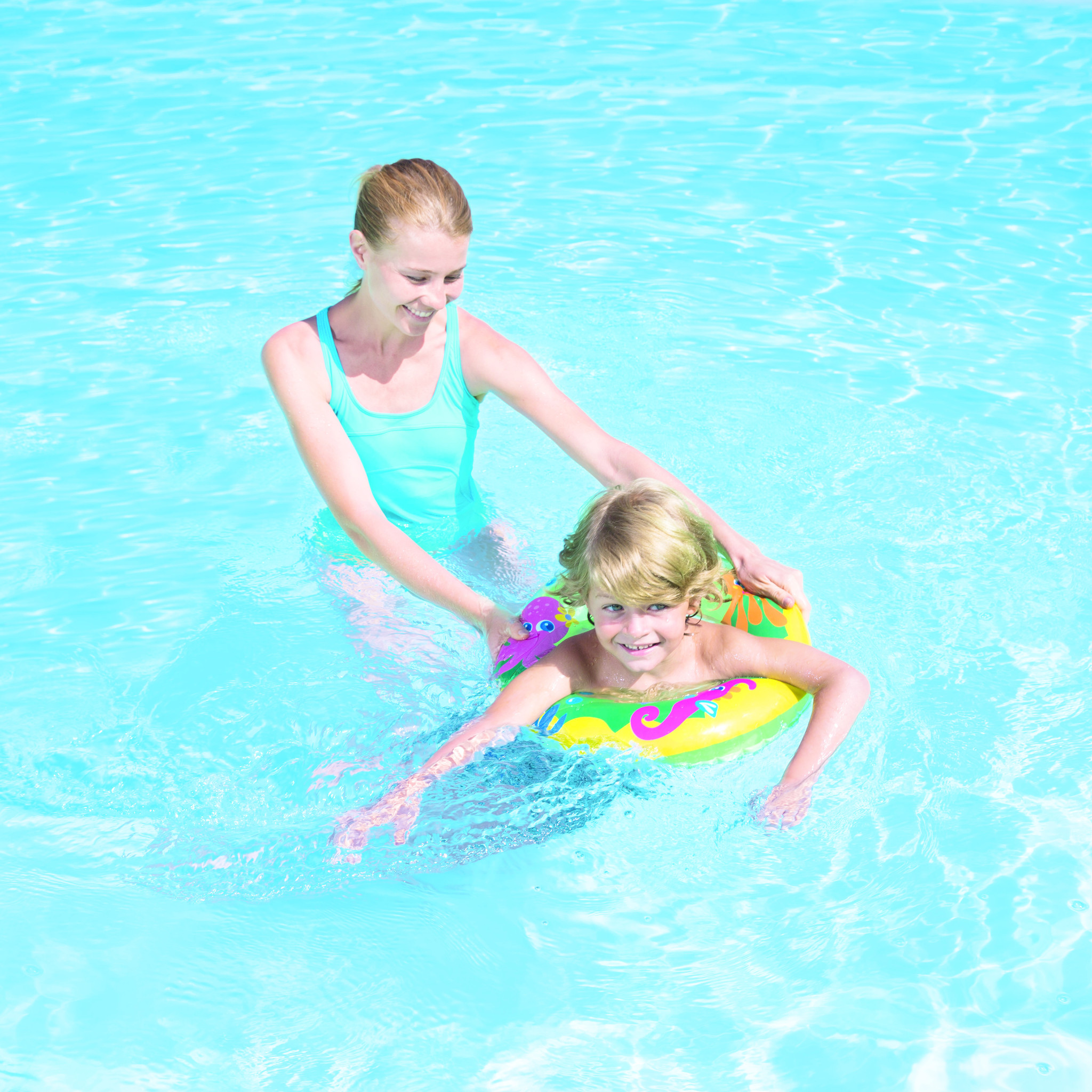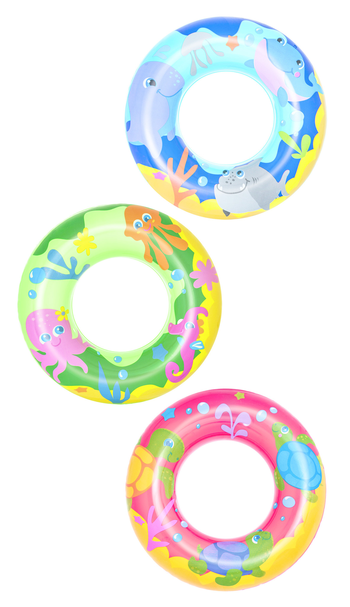 Zwemring in assorti van 3 verschillende dessins in vriendelijke kleuren. Leeftijd: 3-6 jr. Afmeting: Ø 46 cm.