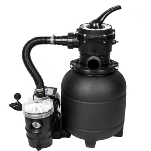 Dit filtersetje bevat een pomp met voorfilter en een zandfilter met zeswegkraan.