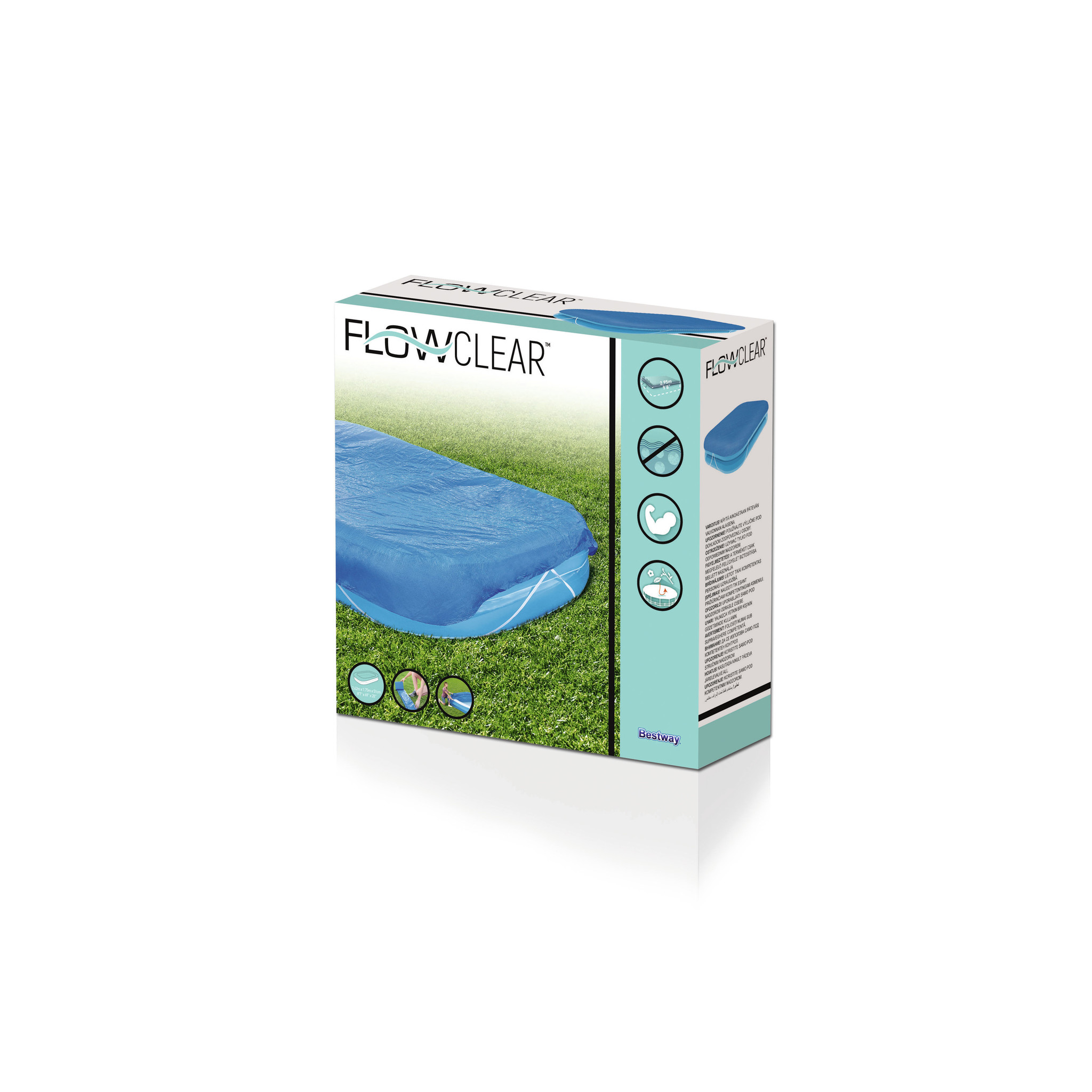 Cover (afdekkleed) voor rechthoekig familie zwembad van 262x175x51 cm. Incl. rubberbandjes ter bevestiging en afvoergaten om overtollig water te lozen. Van blauw PE. Afmeting: 295×220 cm.
