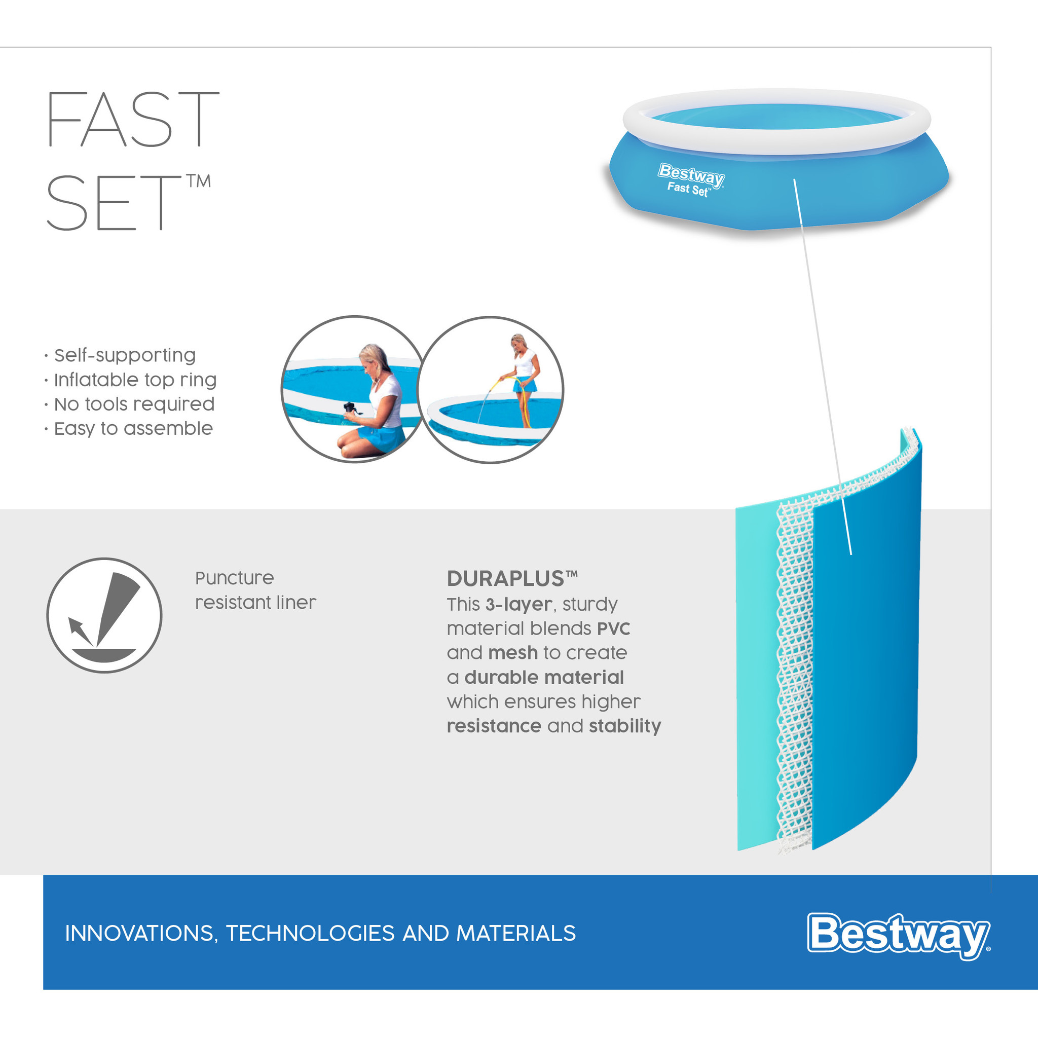 Met deze snelle en gemakkelijke Bestway Fast Set zwembad set bent u in een mum van tijd klaar voor een dag vol zwemplezier! Het Fill & Rise installatieproces is eenvoudig: kies een waterpas oppervlak, blaas de bovenste ring op en het zwembad zal st
