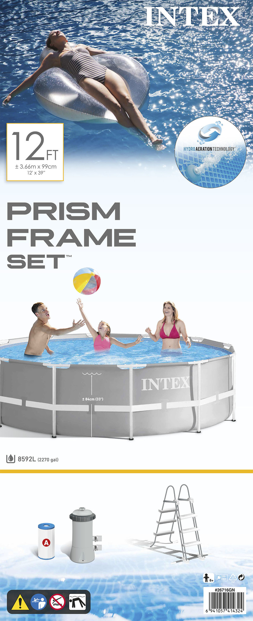 Intex Prism Frame Zwembad – Ø 366cm x 99cm.Sterk, duurzaam en flexibel door de 3 laagse “”Super Though”” wanden .Inhoud (90%): 8.592 L.Inclusief bijpassende filterpomp met een debiet van 2.271 L / u (aansluitklaar -filters type A).Inclusief bijpassende