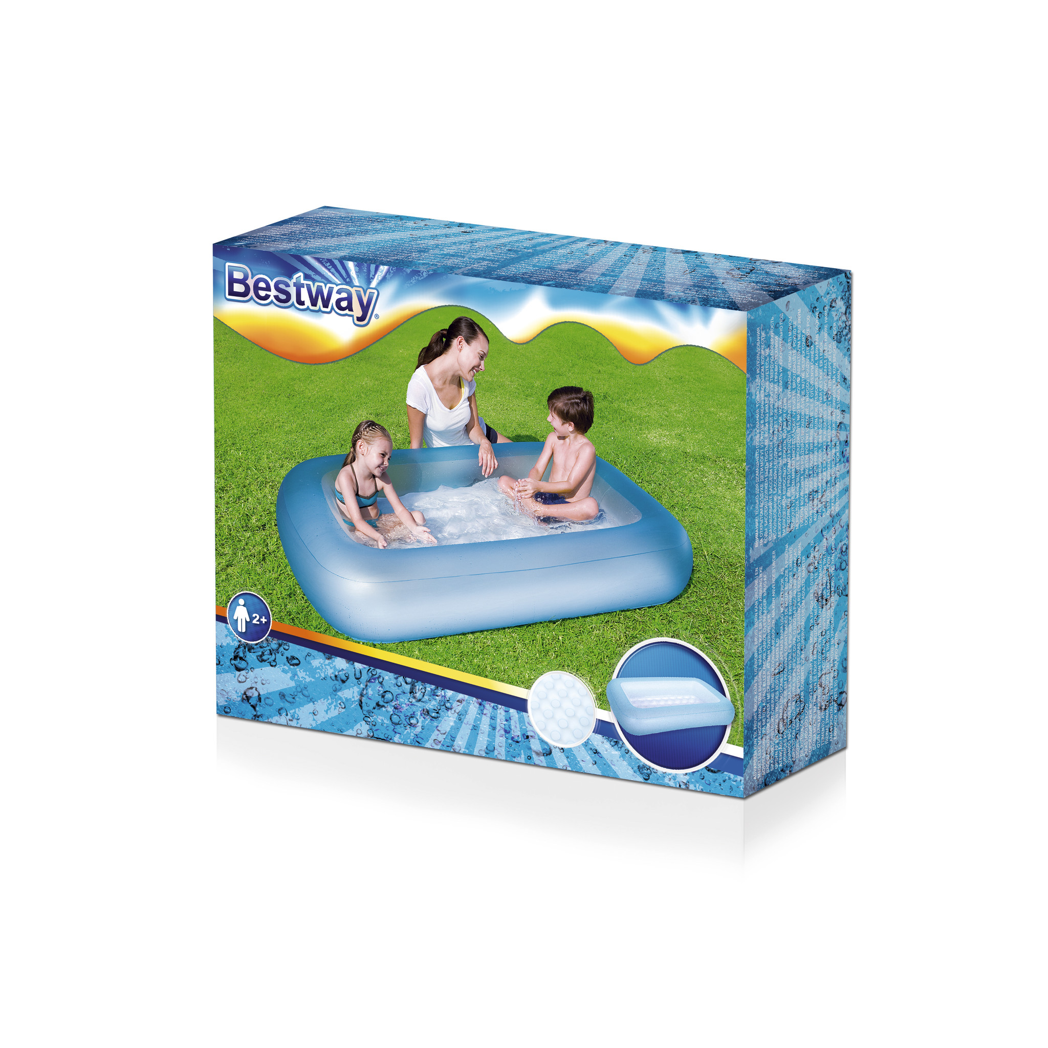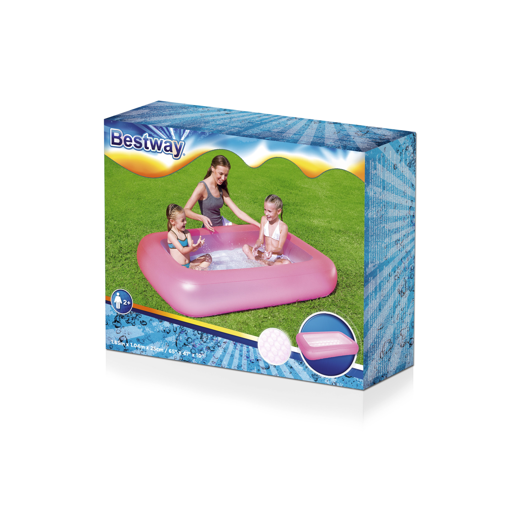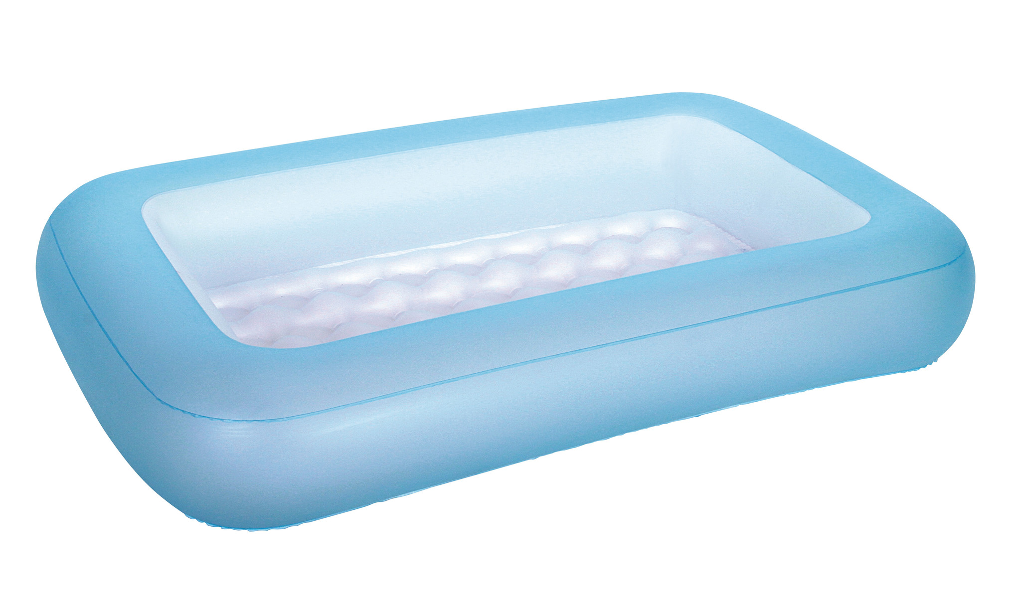 Rechthoekig kinderbad met zachte, opblaasbare bodem. In 2 kleuren assorti: blauw en roze en met reparatie patch. Watercapaciteit: 102 ltr. Van 0,24 mm vinyl. Leeftijd: 2+. Afmeting: 165x104x25 cm.